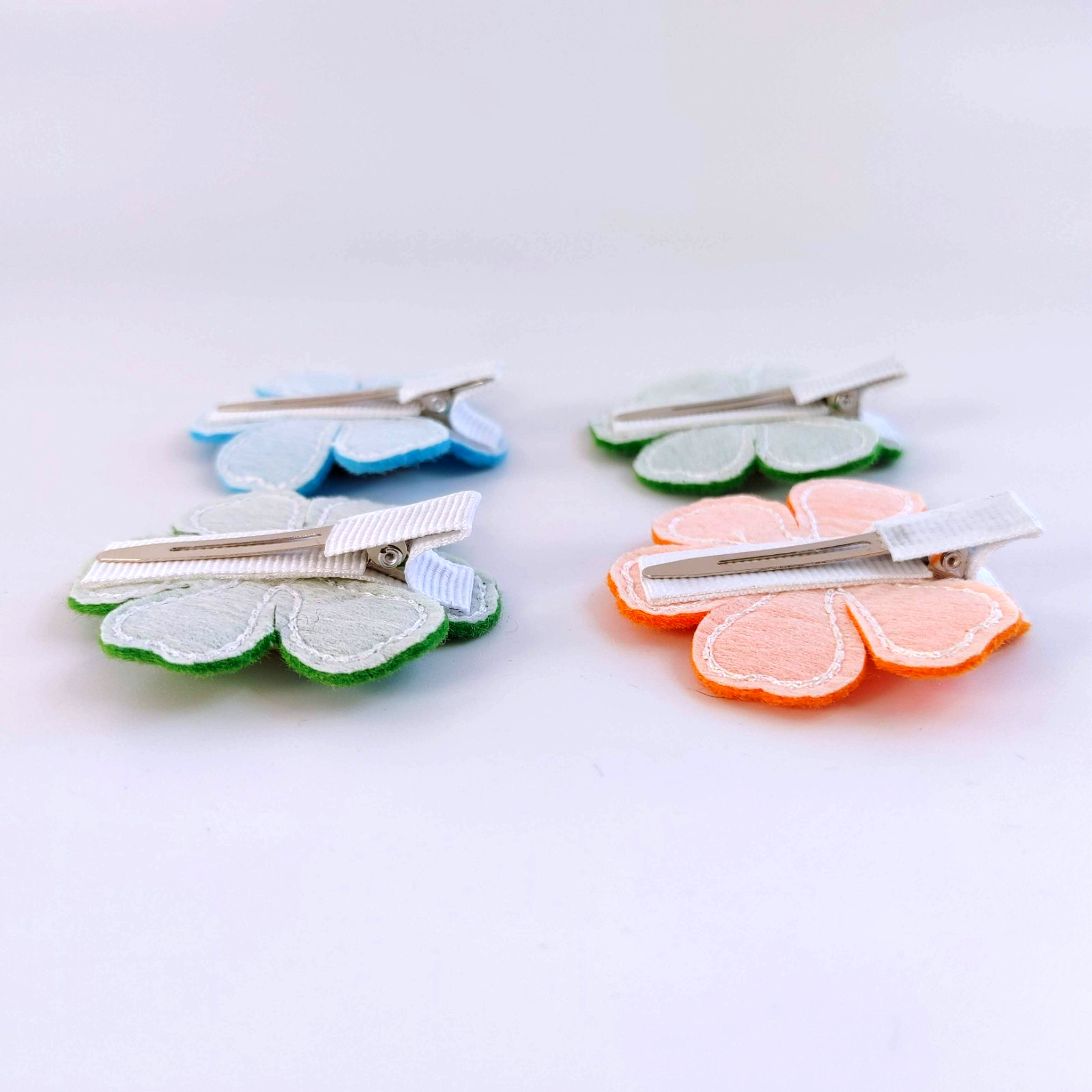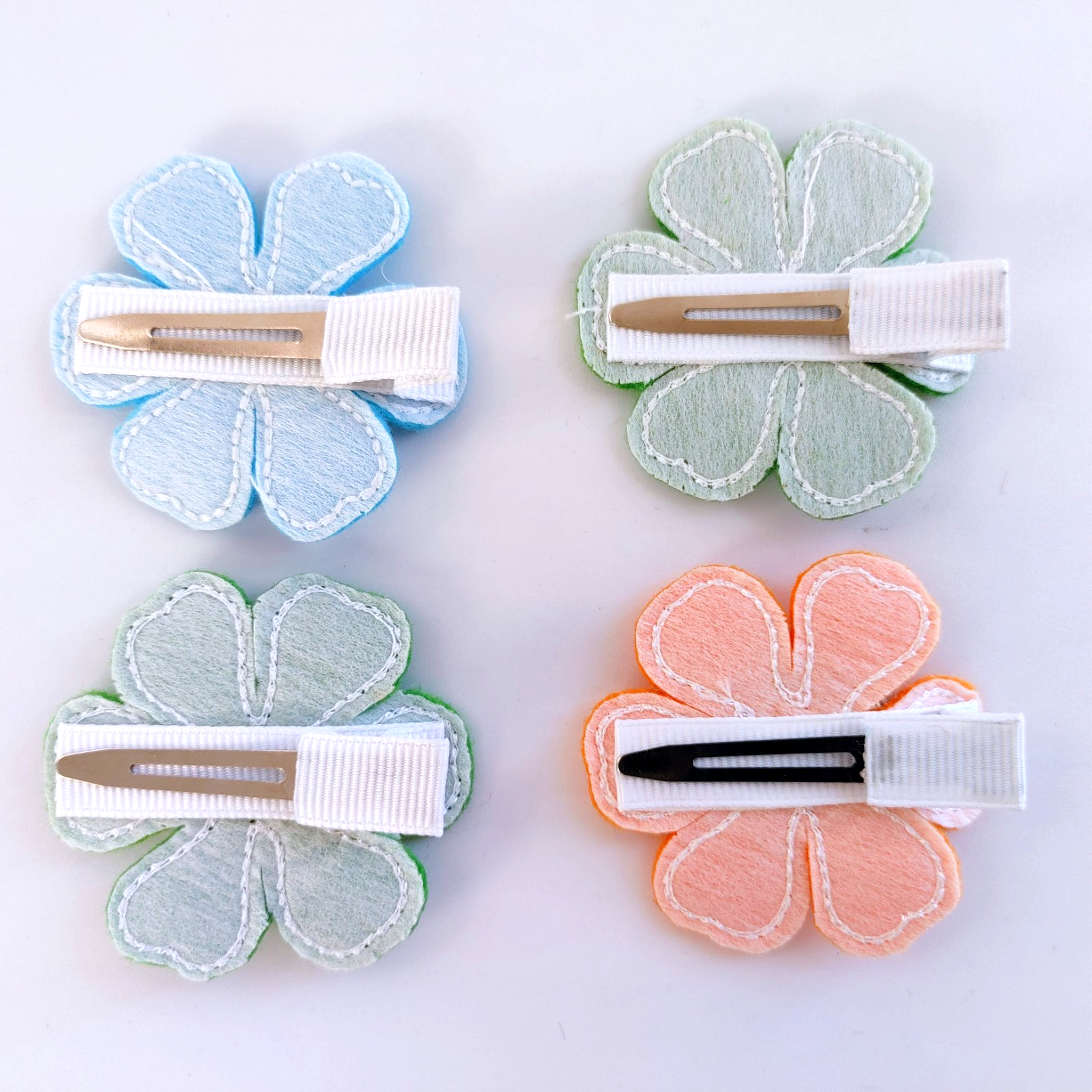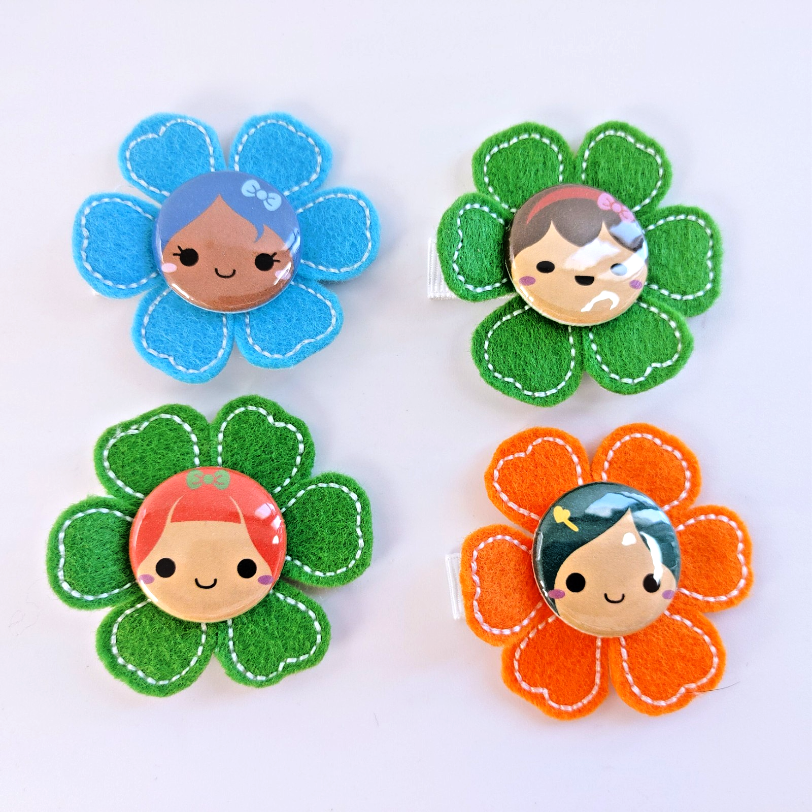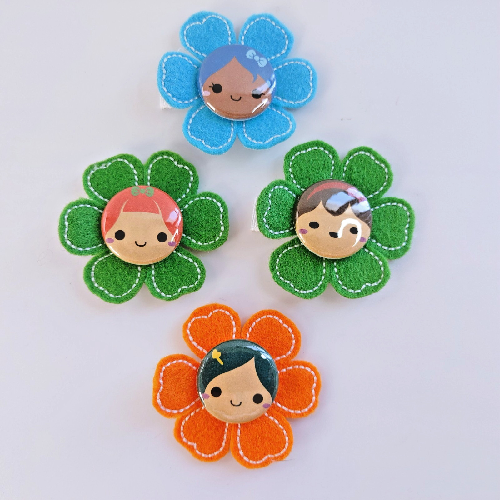 Design: Multi-colored felt flower with a decorative cartoon button accent.