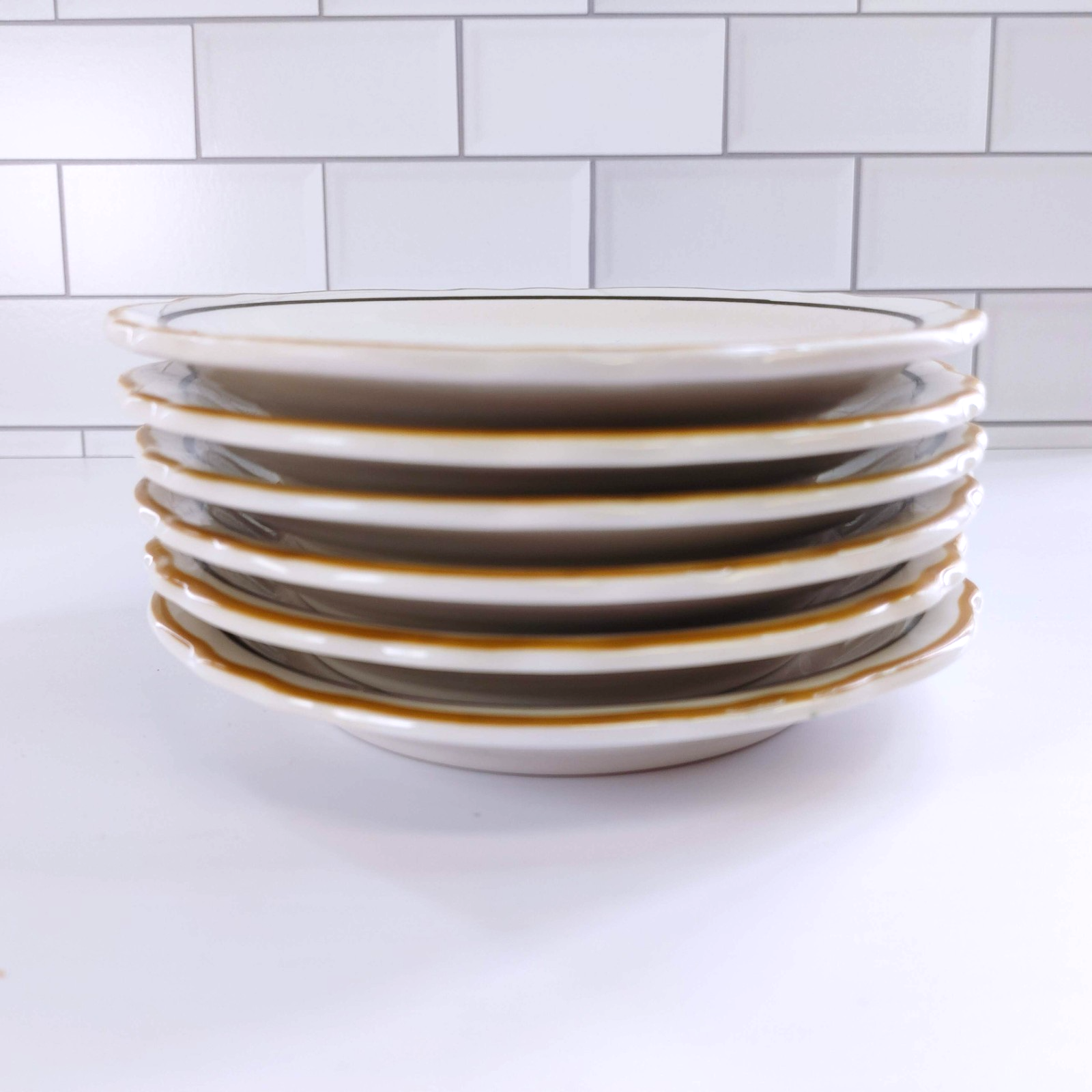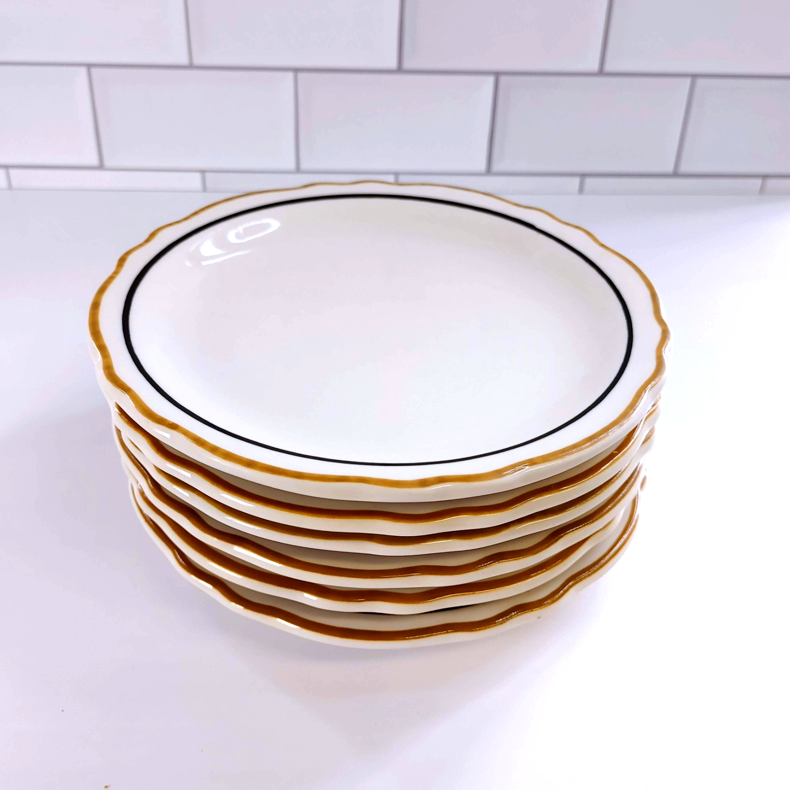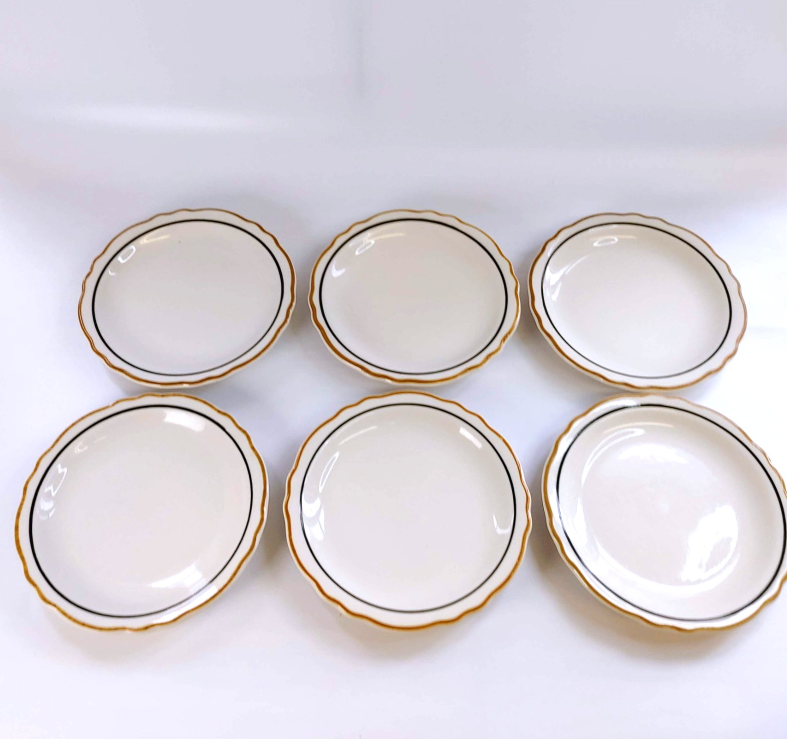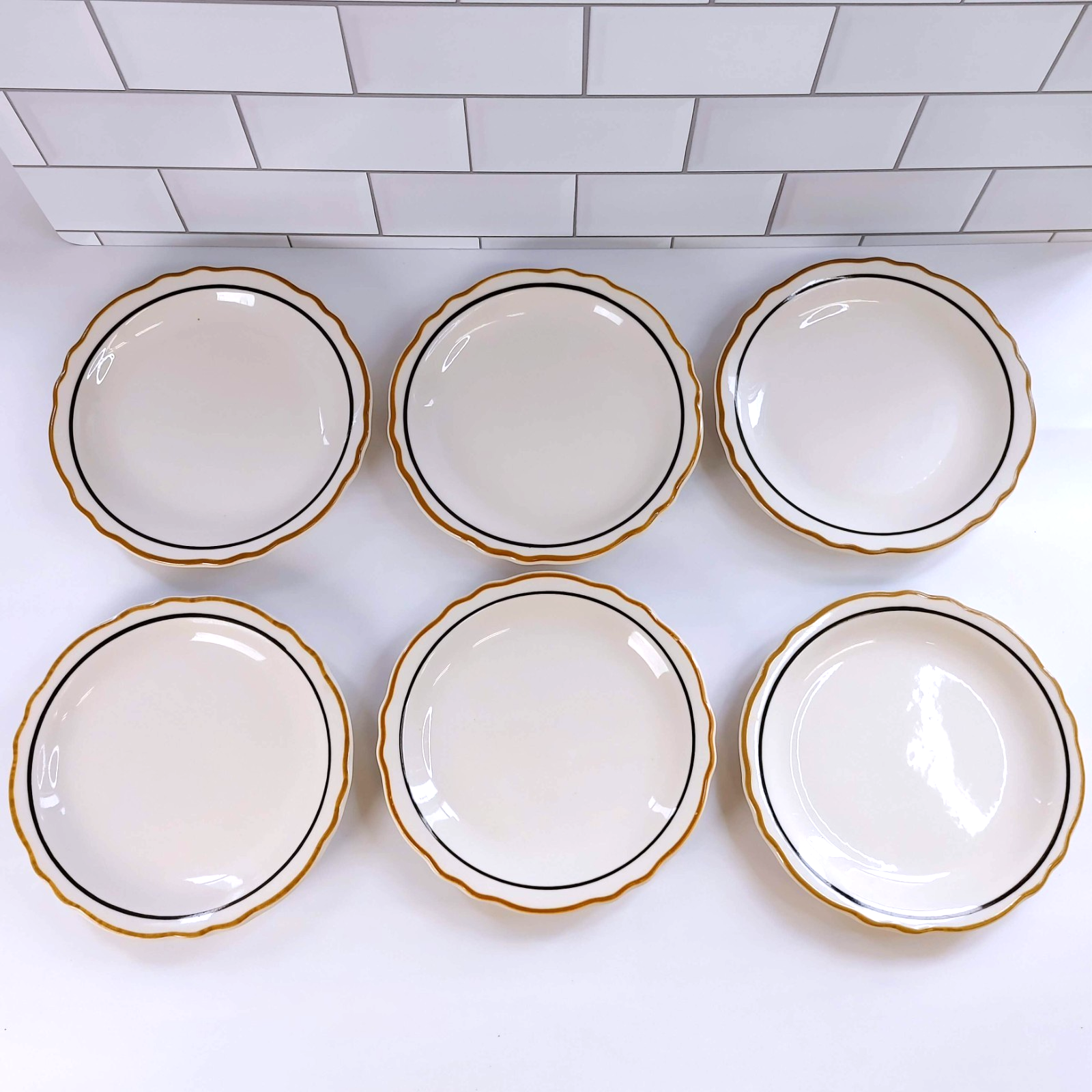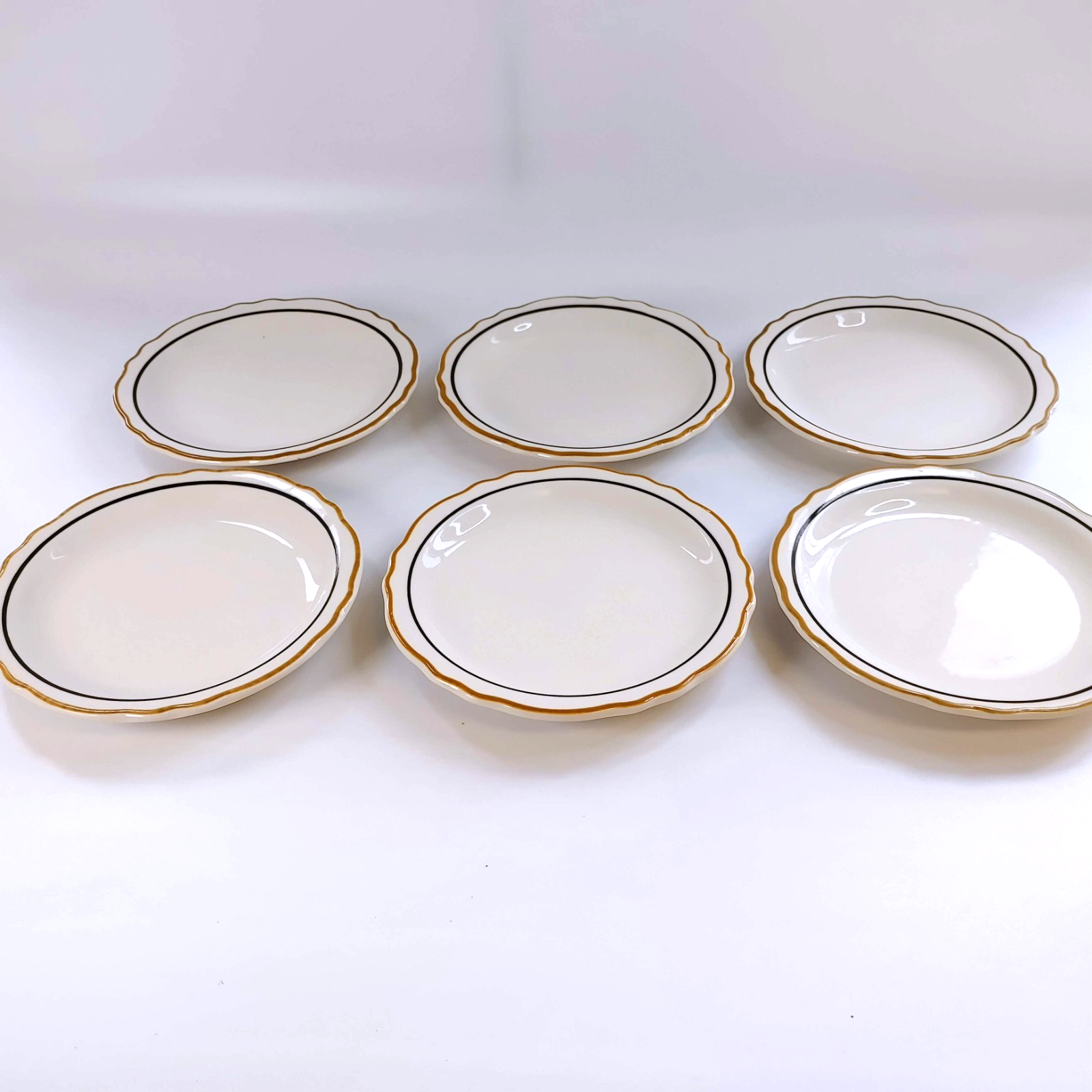 Up for sale is a beautiful set of six (6) Homer Laughlin Salad Plates in the elegant Dorado pattern. These 6.5" plates feature a crisp white body accented by a sophisticated double band of gold and black, making them perfect for both professional restaurant use or a refined home table setting.