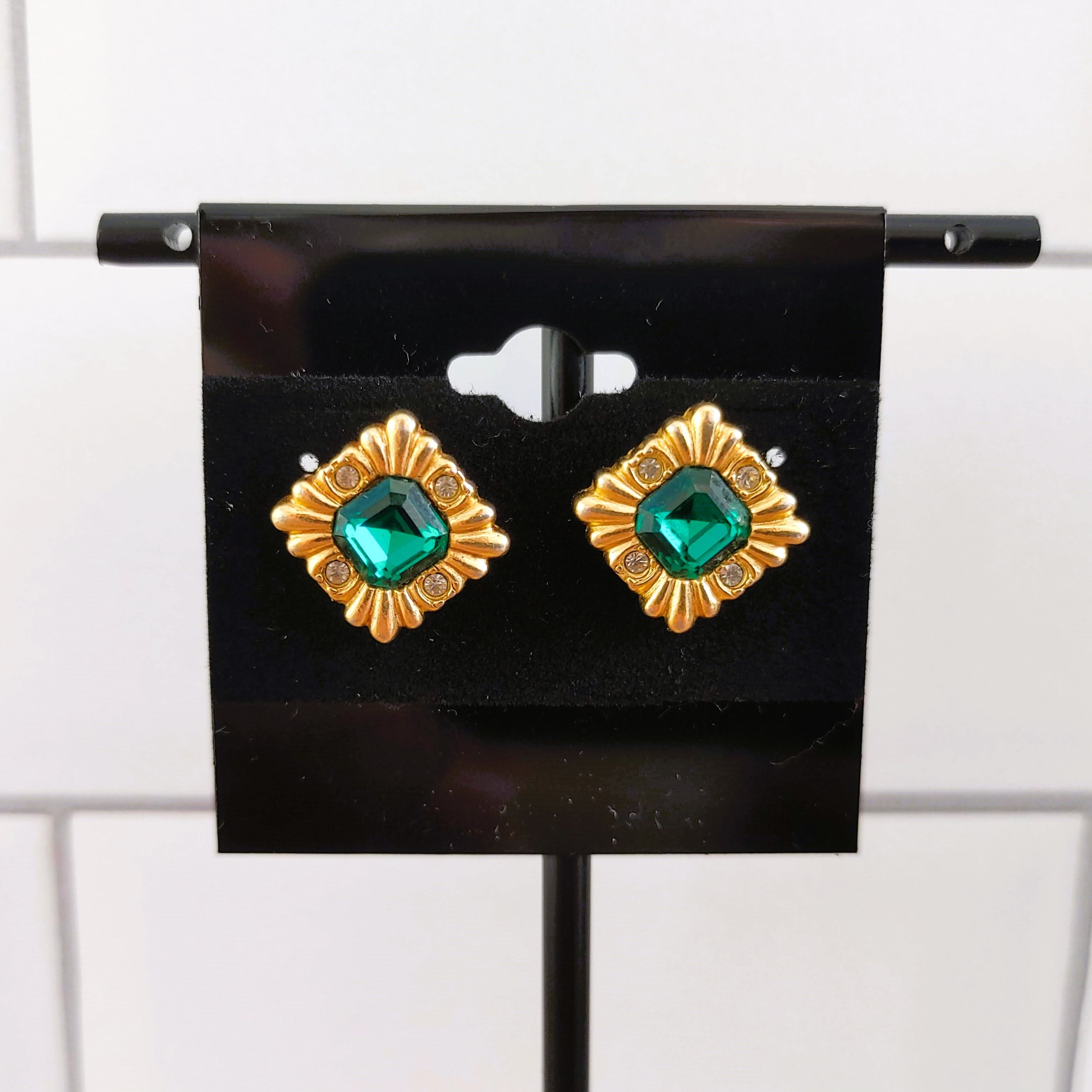 Here's what you'll love about these vintage gold-tone and green rhinestone earrings: