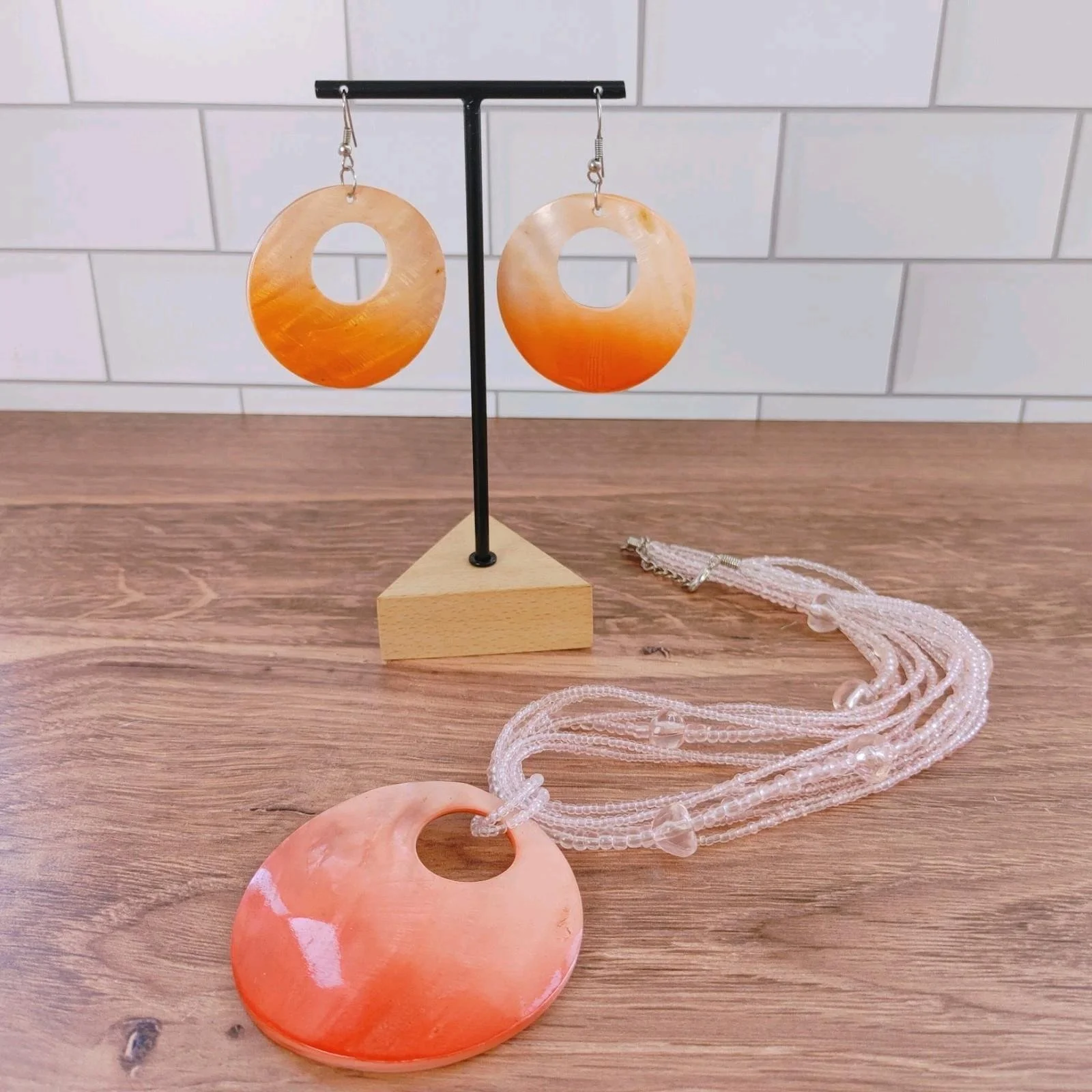 This vibrant, summer-inspired jewelry set features a matching necklace and earring duo, perfect for adding a pop of warm color to any outfit. The set centers around a beautiful "sunset ombre" aesthetic with smooth, organic shapes.