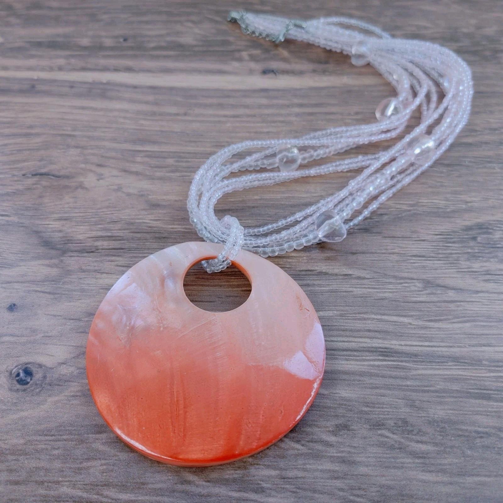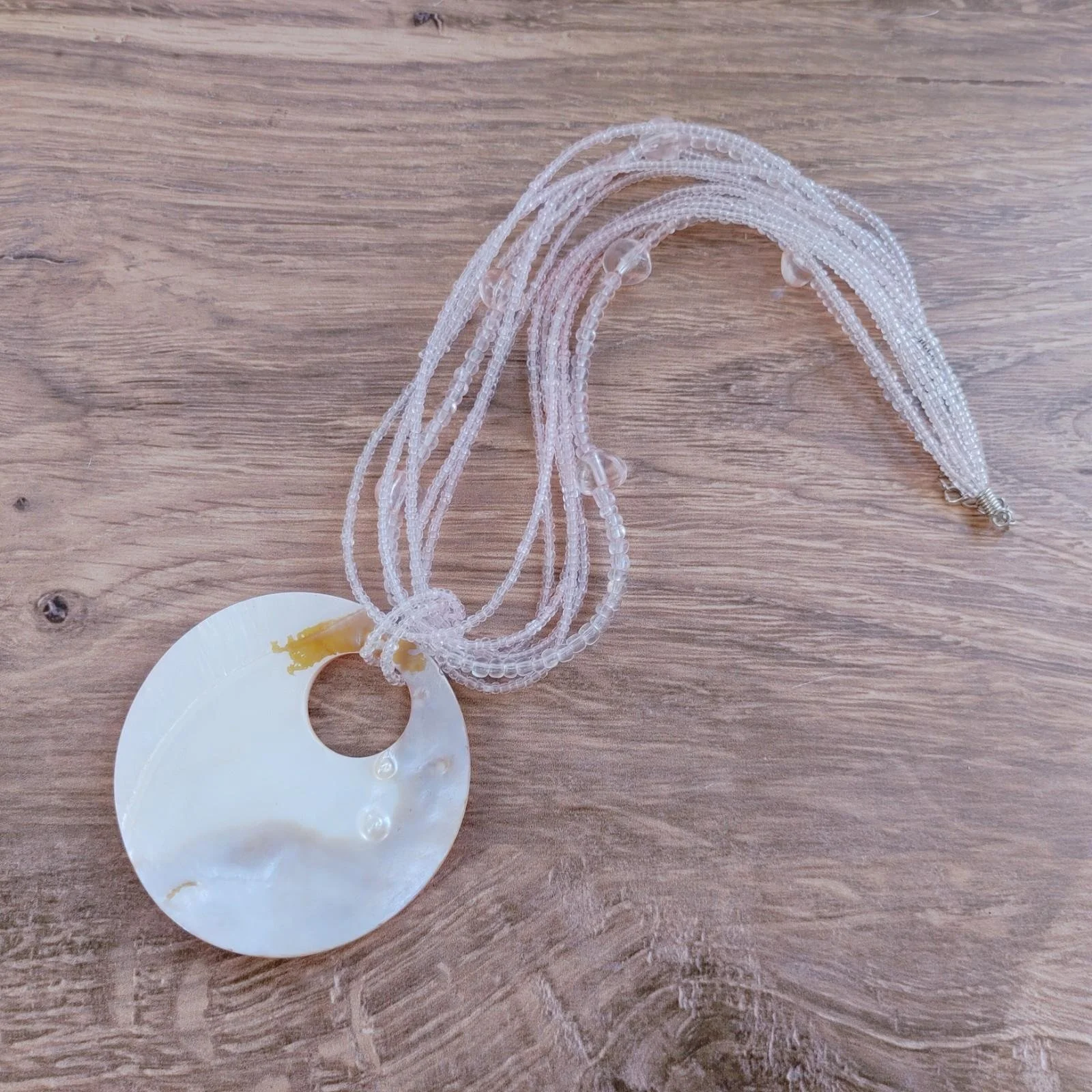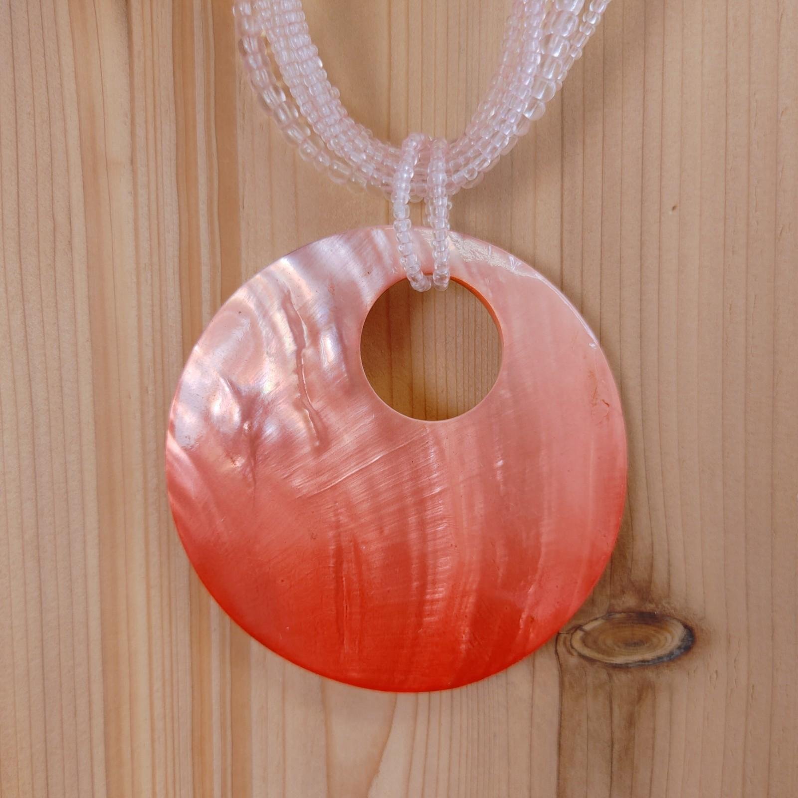 Pendant : A large, statement-sized circular resin or polished shell pendant with an off-center cutout.