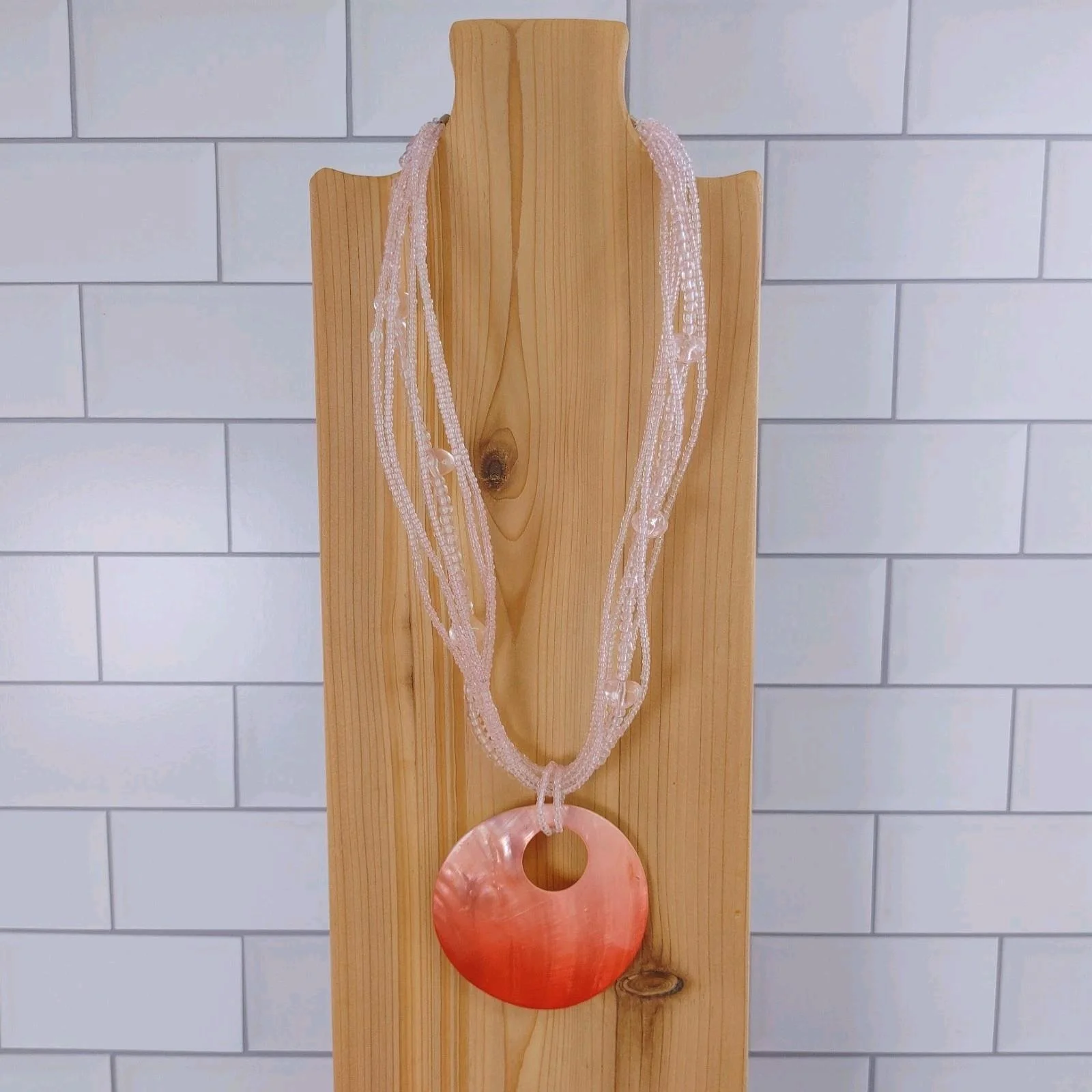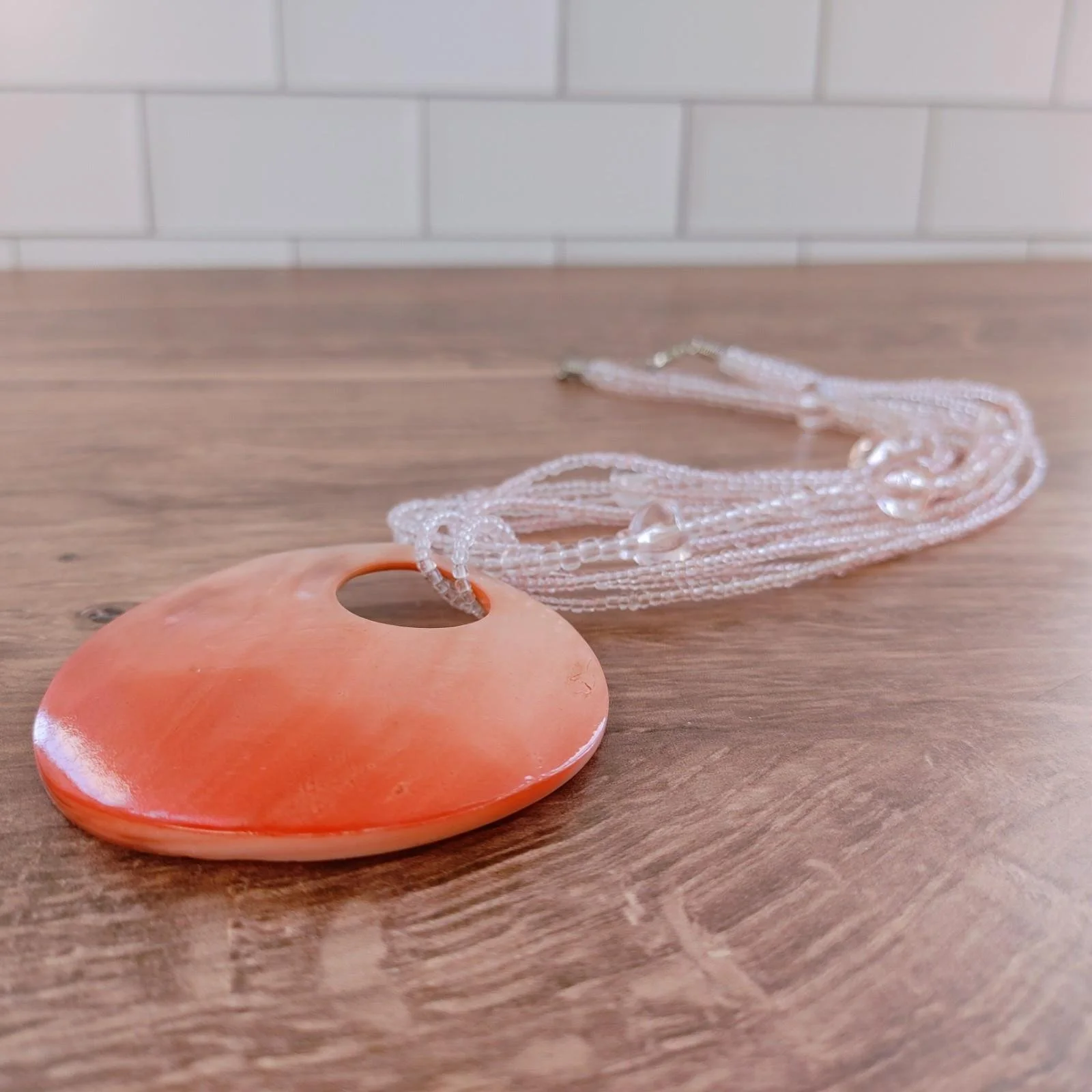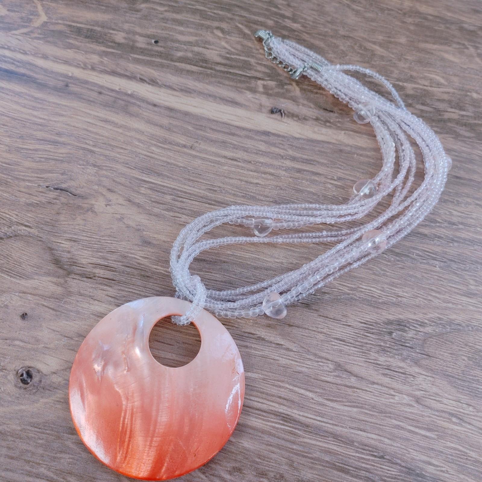 Pendant : A large, statement-sized circular resin or polished shell pendant with an off-center cutout.