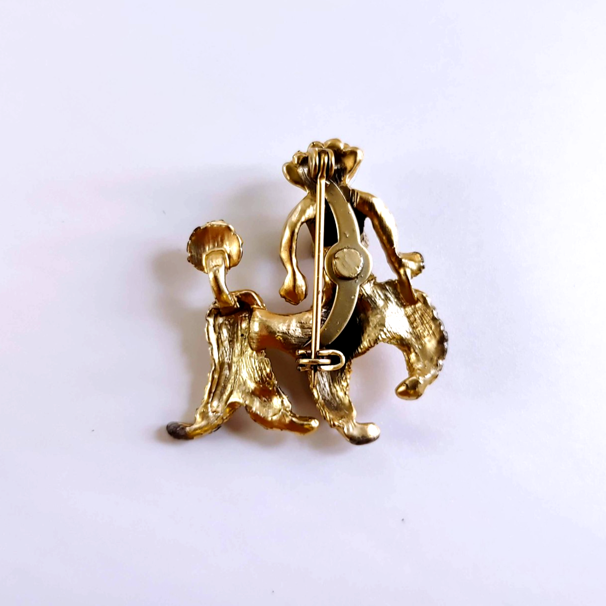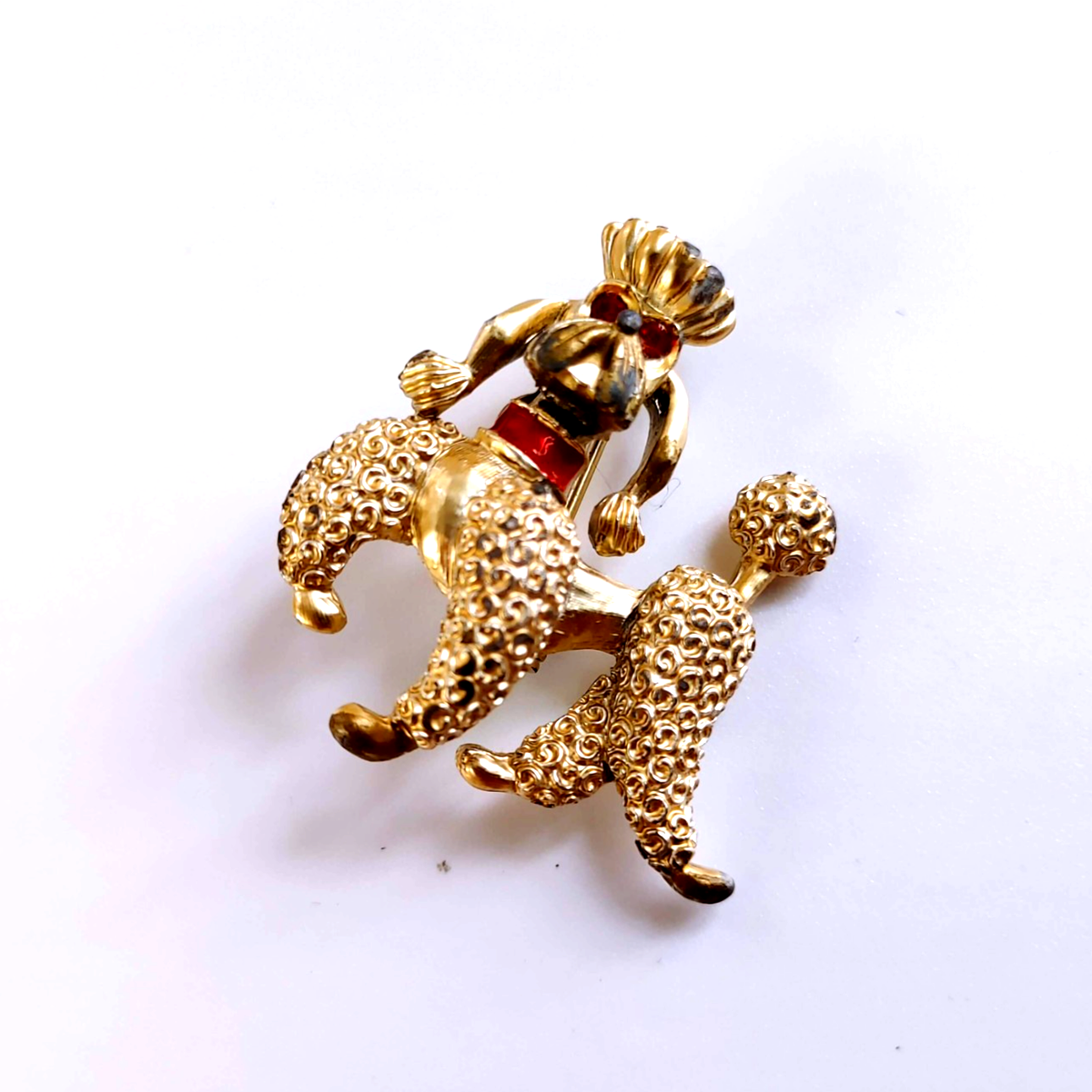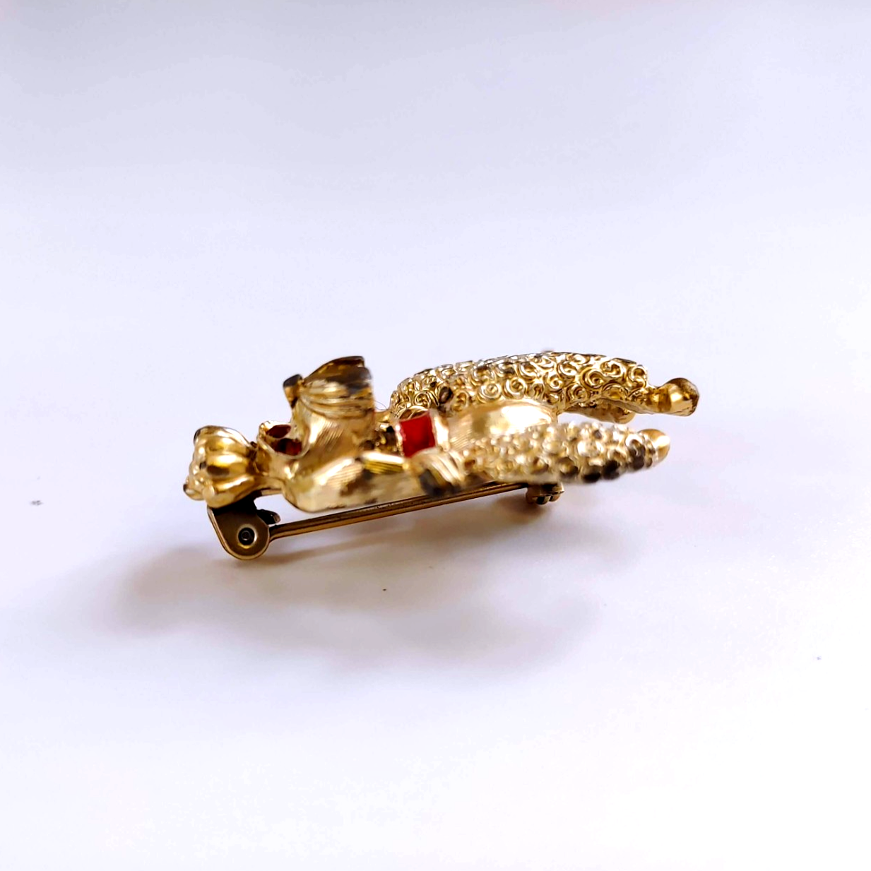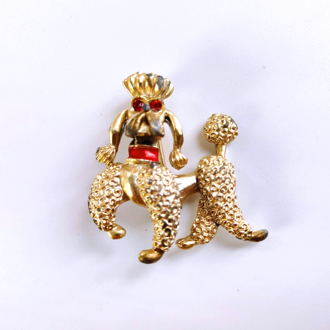 Design: Gold-tone poodle with vibrant red rhinestone eyes and a matching red rhinestone collar.