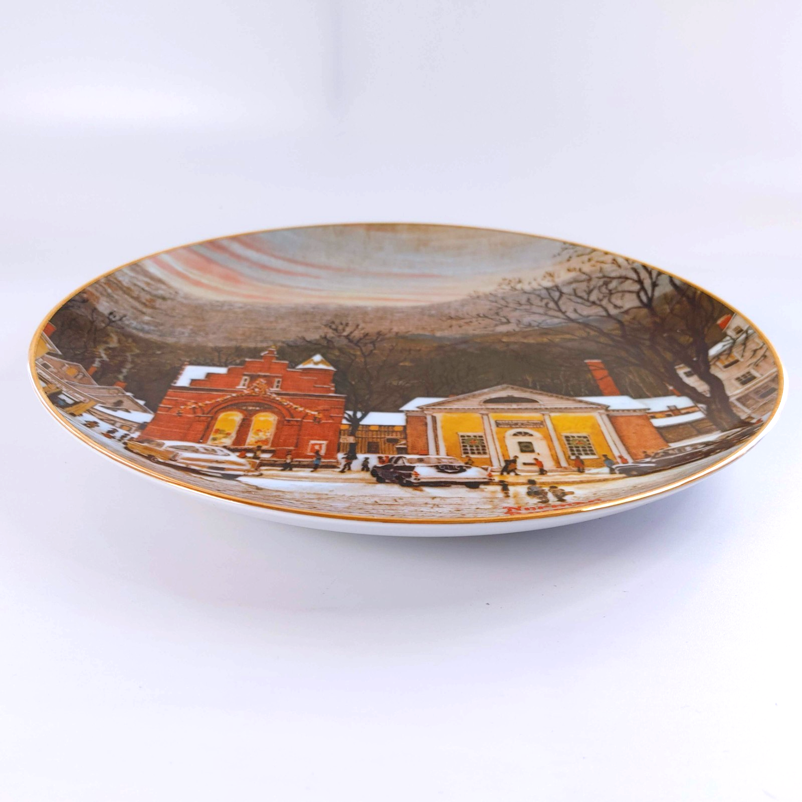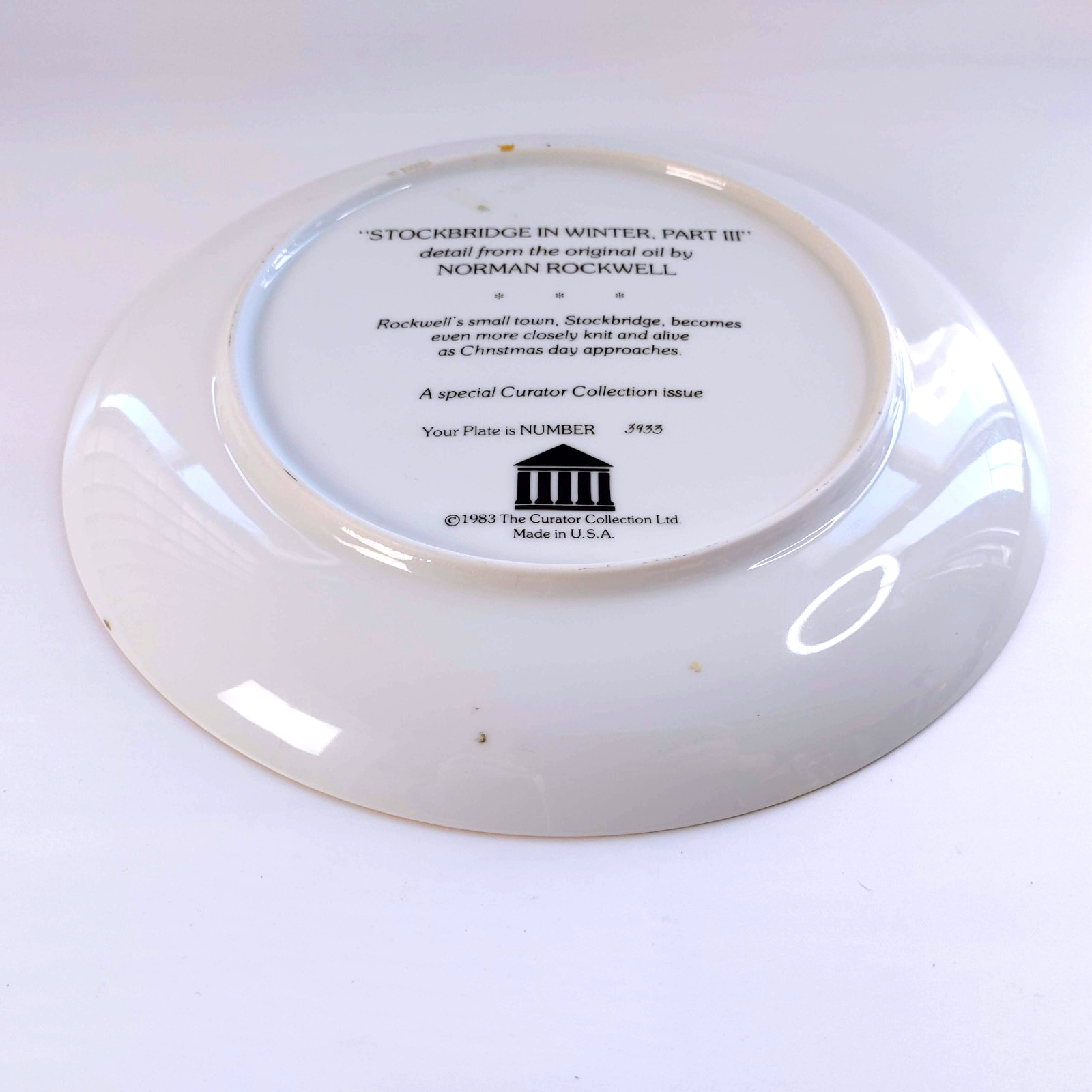 The vintage 1983 Norman Rockwell Stockbridge in Winter Part 3 The Curator Collection collector plate is a decorative piece featuring a round shape and multicolor design. Made of porcelain, this limited-edition plate features a winter theme and is part of a series produced by Norman Rockwell in the late 20th century. This American-made collector plate is a nostalgic addition to any collection, with a festive, charming style that is perfect for all occasions.