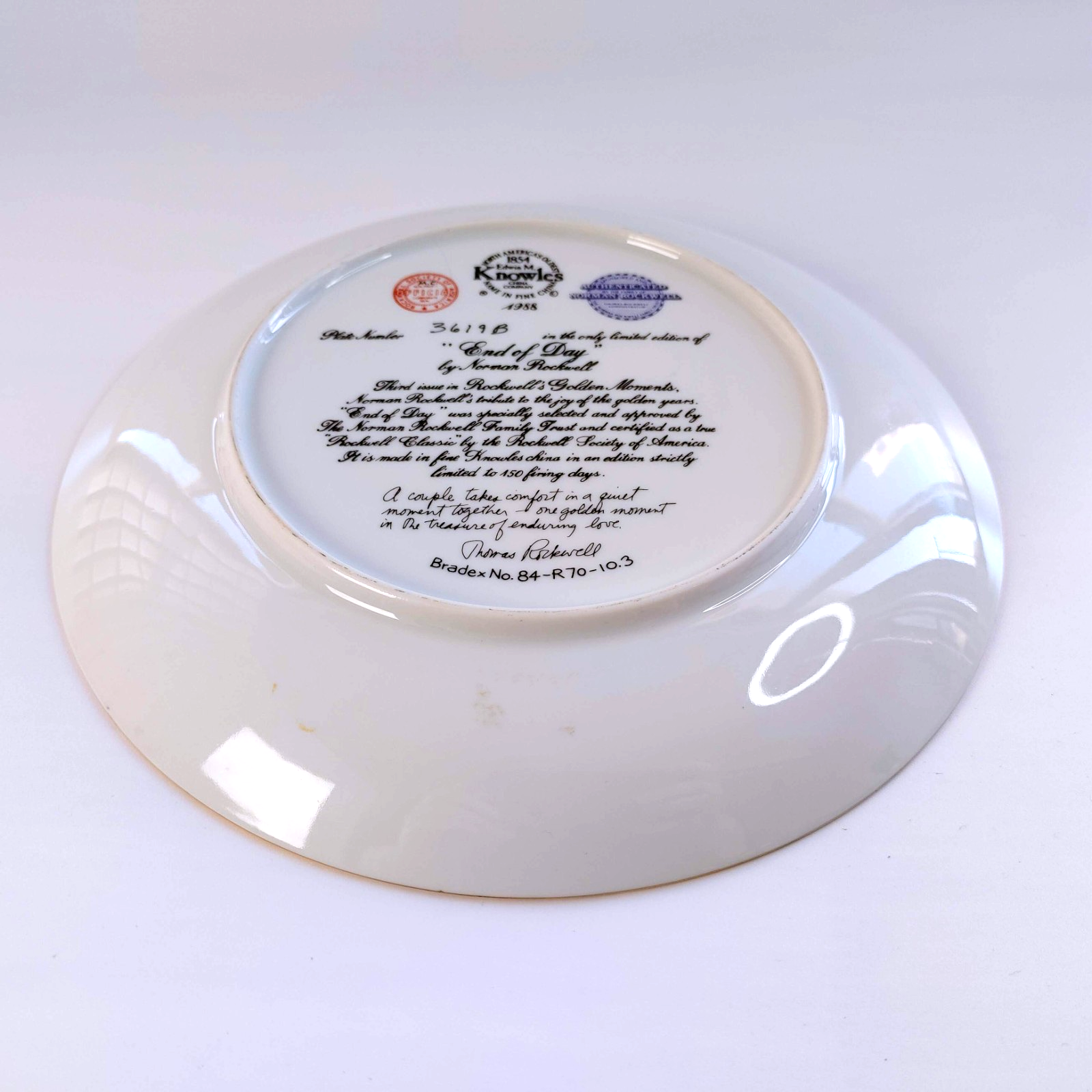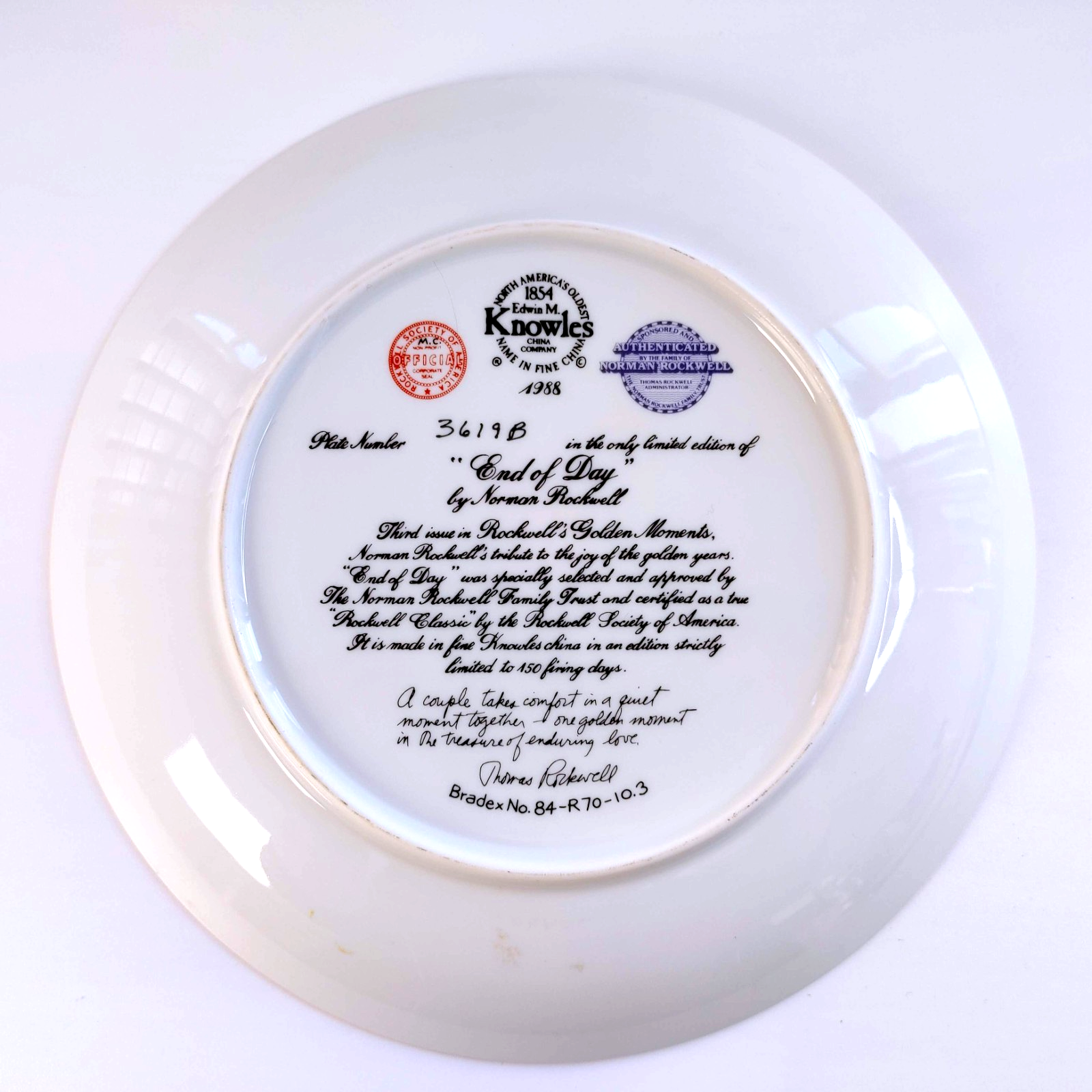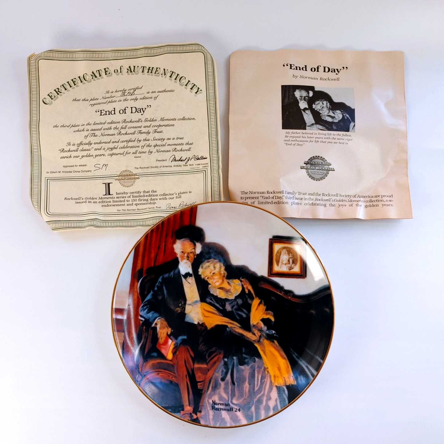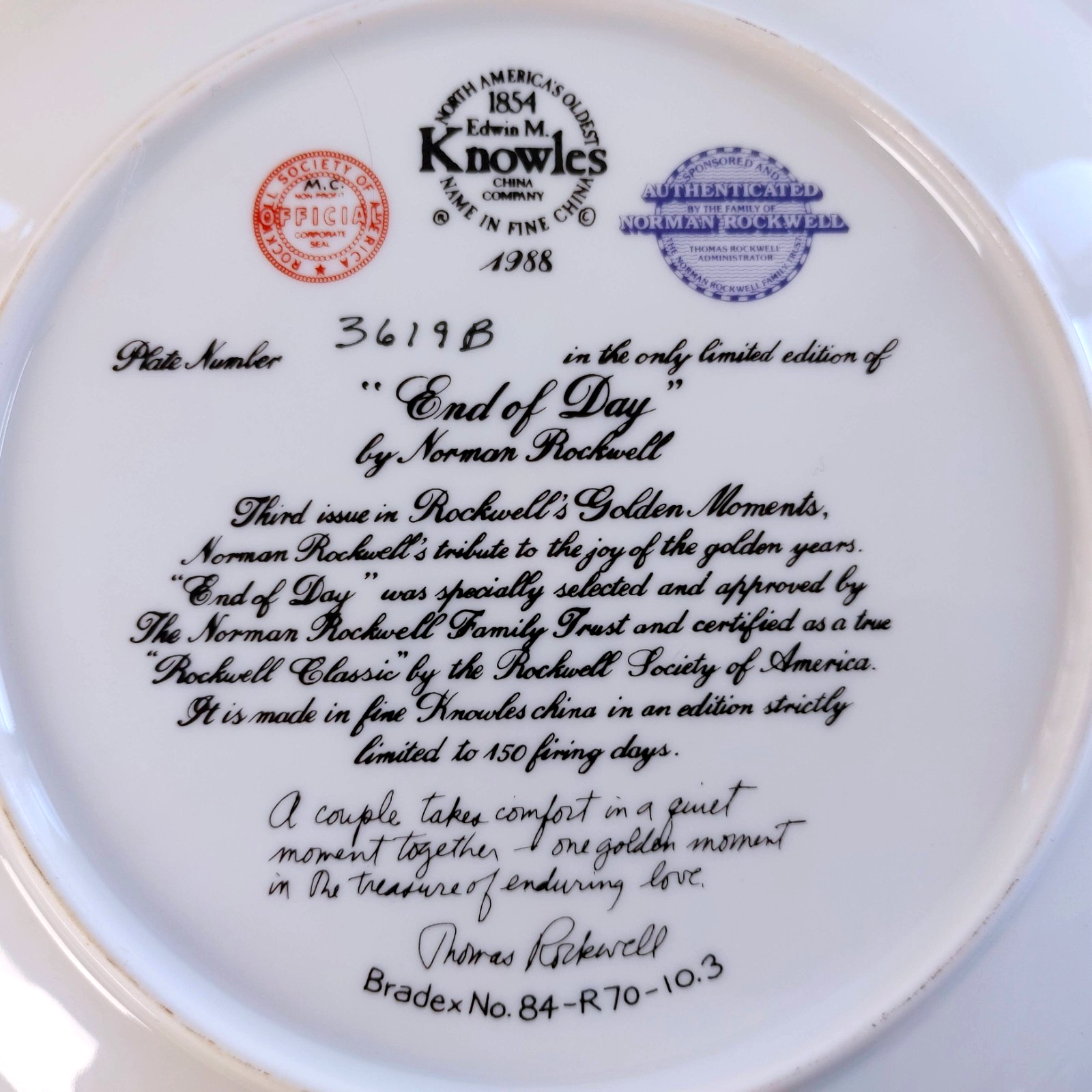 This beautiful collector plate features the heartwarming artwork of Norman Rockwell, titled "End of Day." This piece is the first issue in the limited edition "Rockwell's Golden Moments" series, produced by Edwin M. Knowles, America's Oldest Name in Fine China.