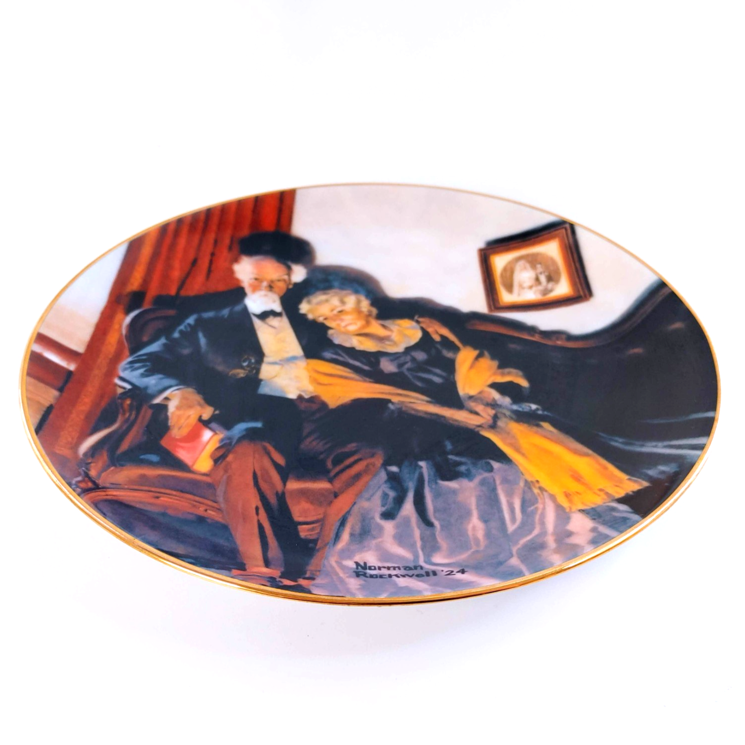 The image depicts a distinguished older couple seated closely on a sofa, a moment of peaceful intimacy that perfectly captures Rockwell's classic Americana style. The plate is signed "Norman Rockwell '24" in the bottom right corner of the artwork.