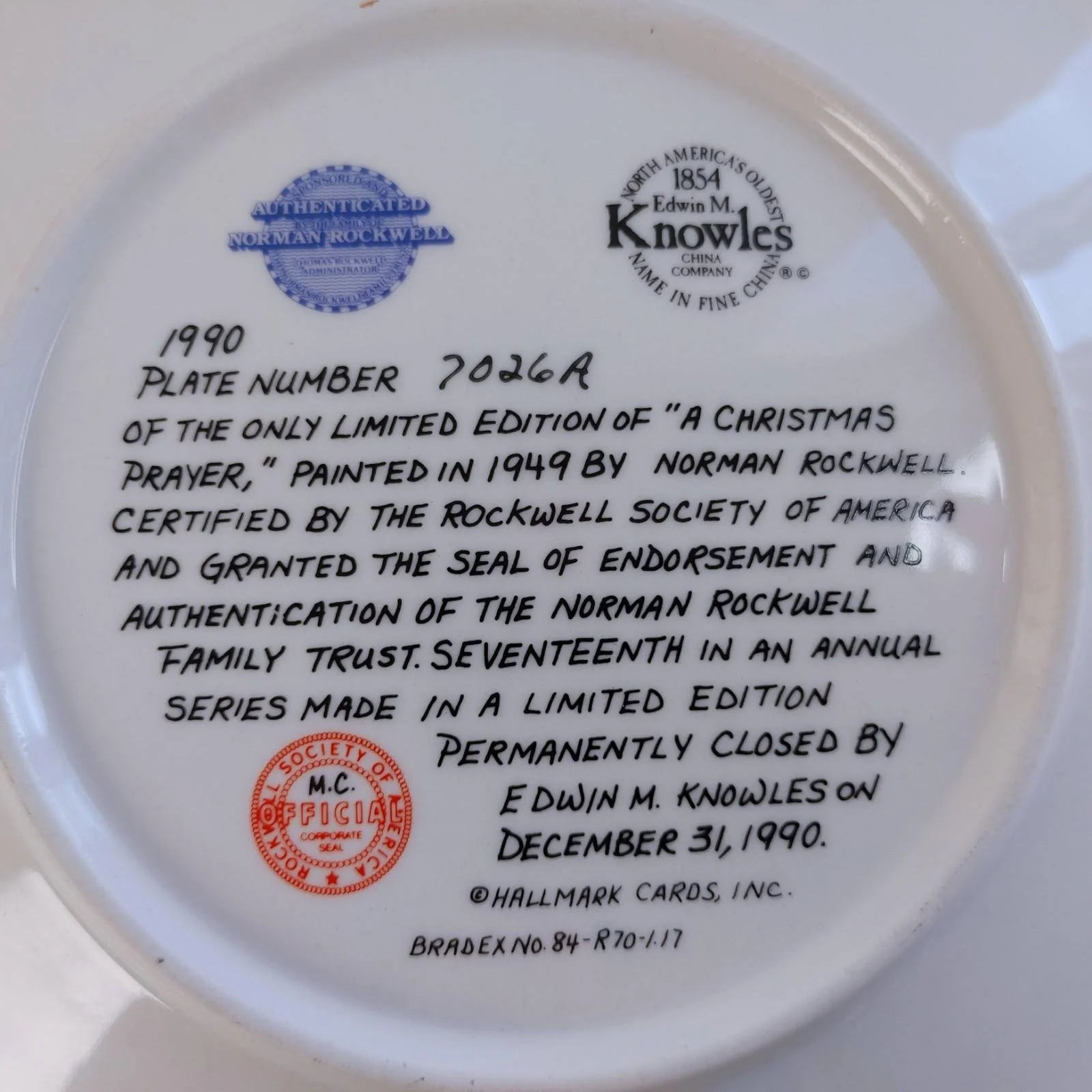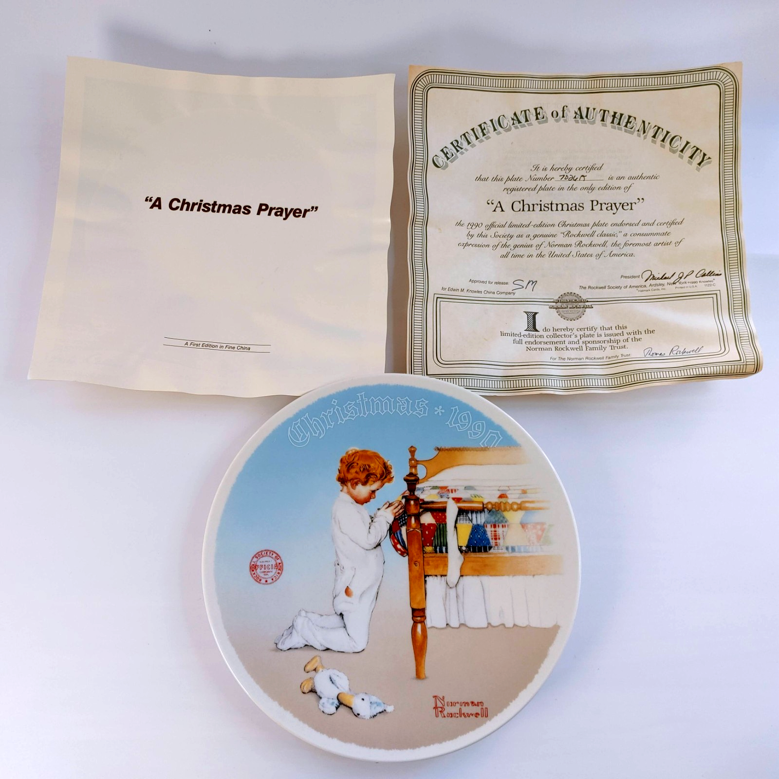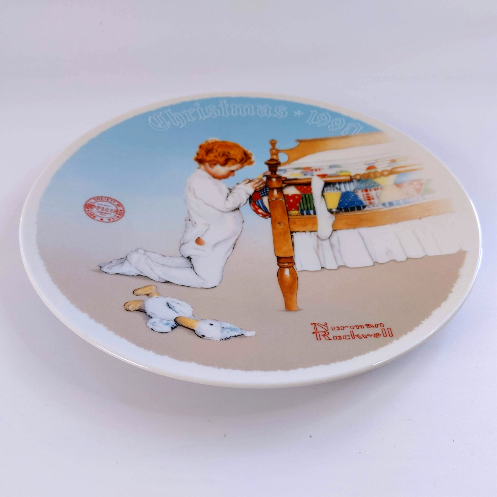 This is a touching vintage collector plate featuring the heartwarming holiday art of Norman Rockwell . The plate, titled "A Christmas Prayer," captures a classic, tender scene of a young, red-headed child in white pajamas kneeling by their bed, presumably saying a prayer on Christmas Eve. A favorite toy duck lies on the floor nearby, and the date "Christmas * 1990" is inscribed at the top.