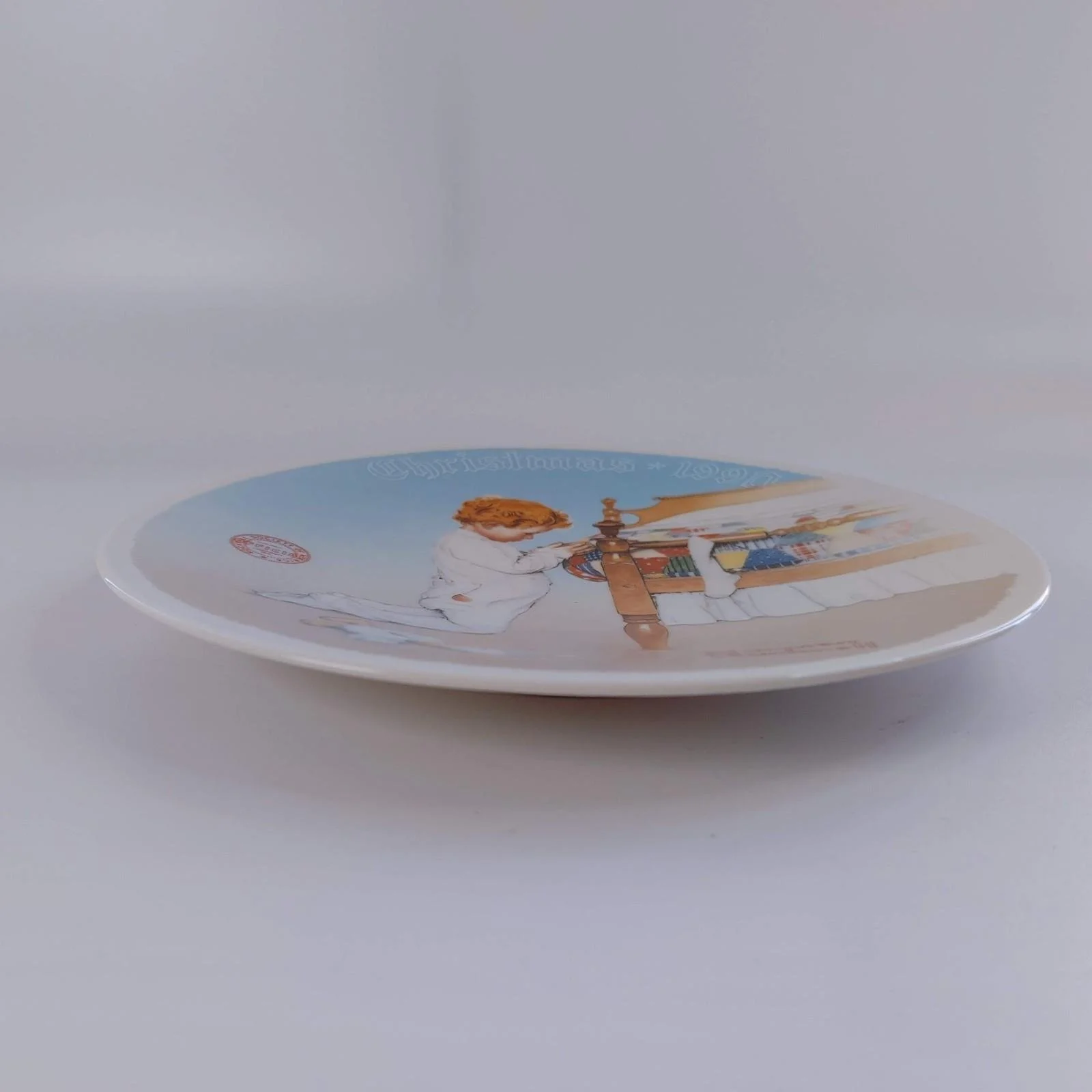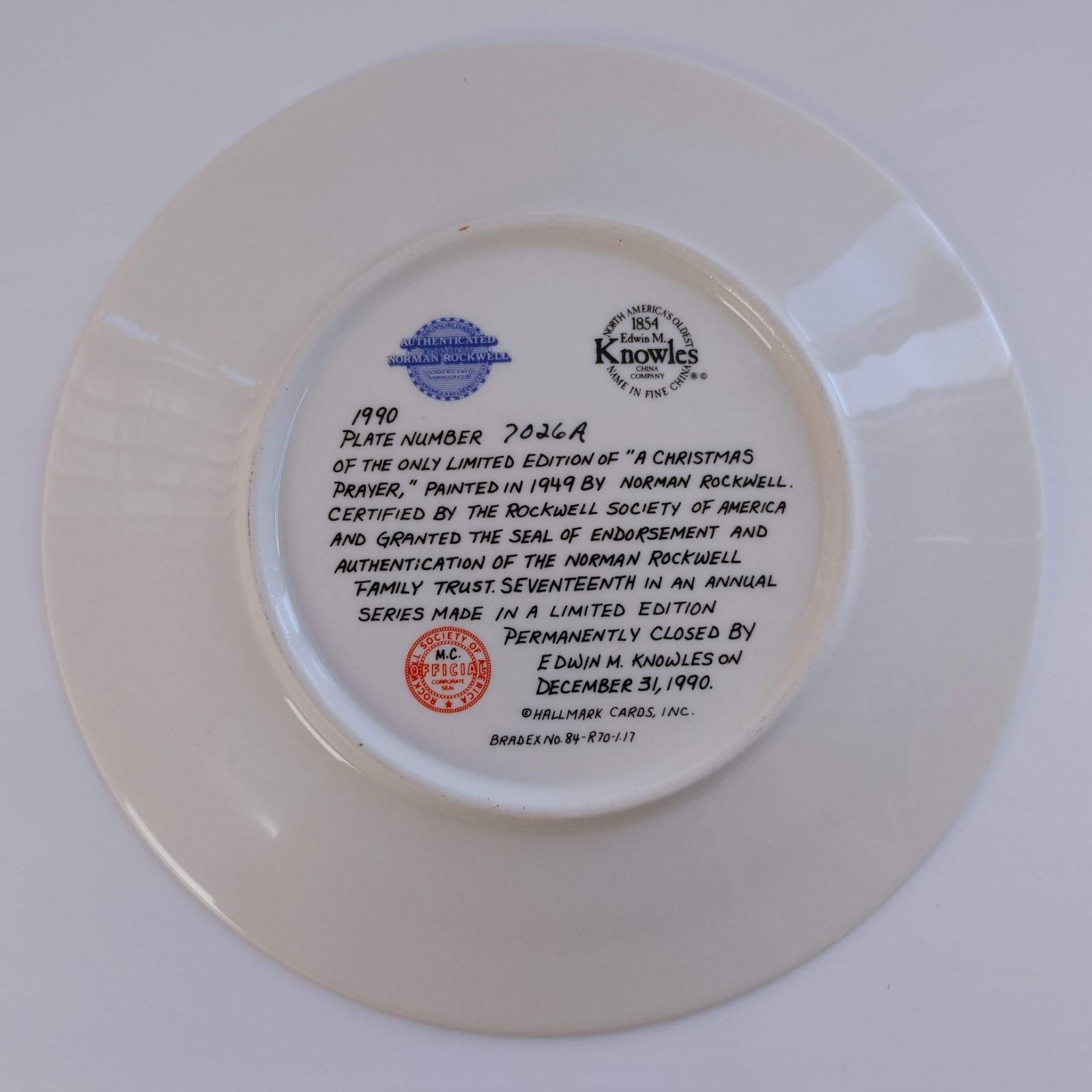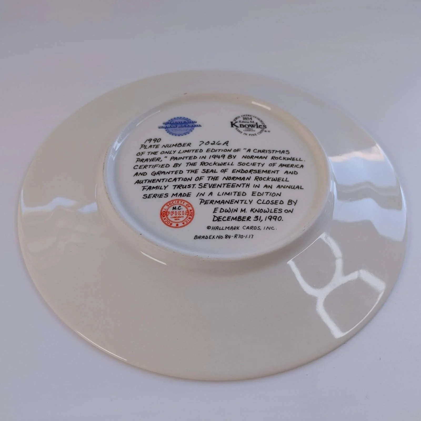 This is a touching vintage collector plate featuring the heartwarming holiday art of Norman Rockwell . The plate, titled "A Christmas Prayer," captures a classic, tender scene of a young, red-headed child in white pajamas kneeling by their bed, presumably saying a prayer on Christmas Eve. A favorite toy duck lies on the floor nearby, and the date "Christmas * 1990" is inscribed at the top.