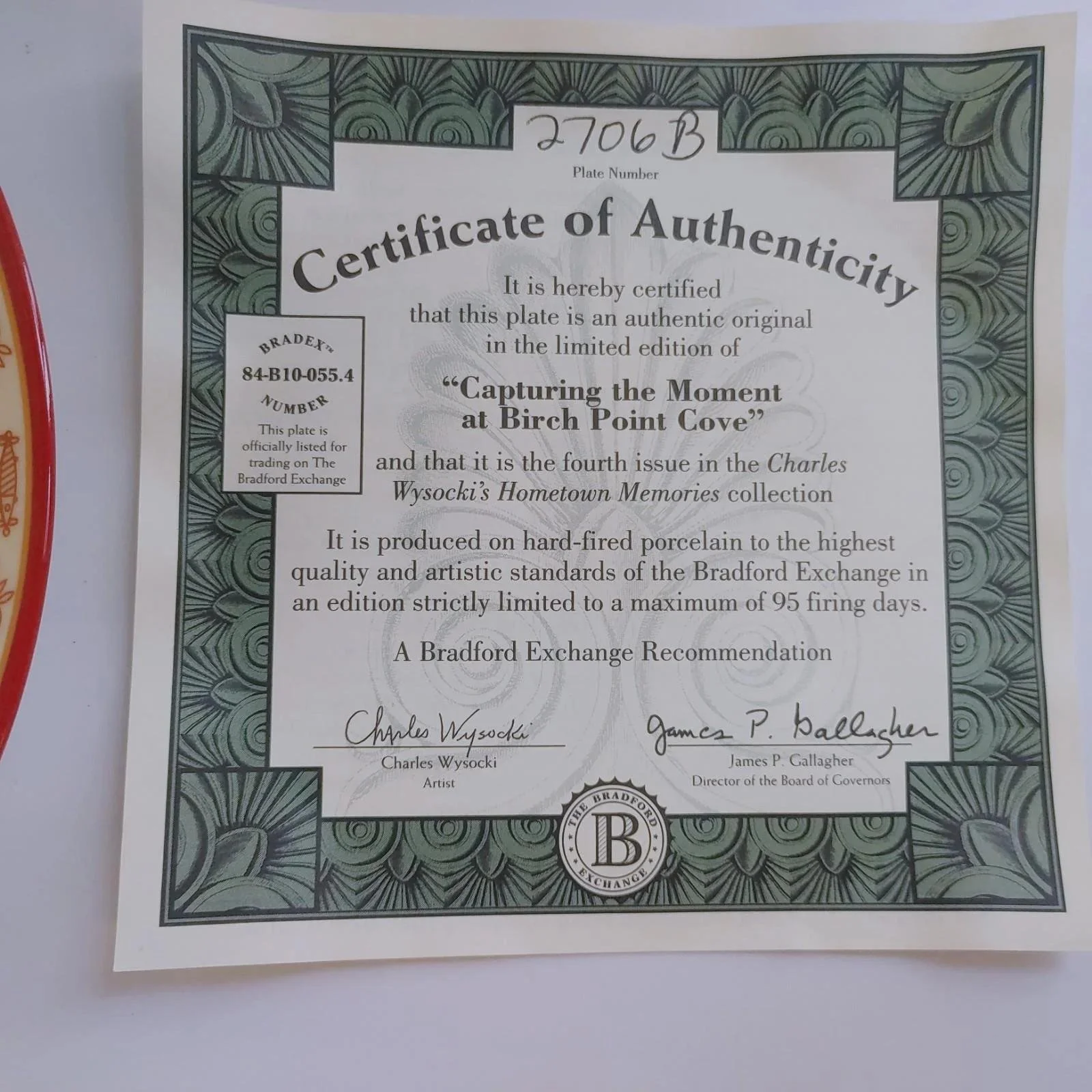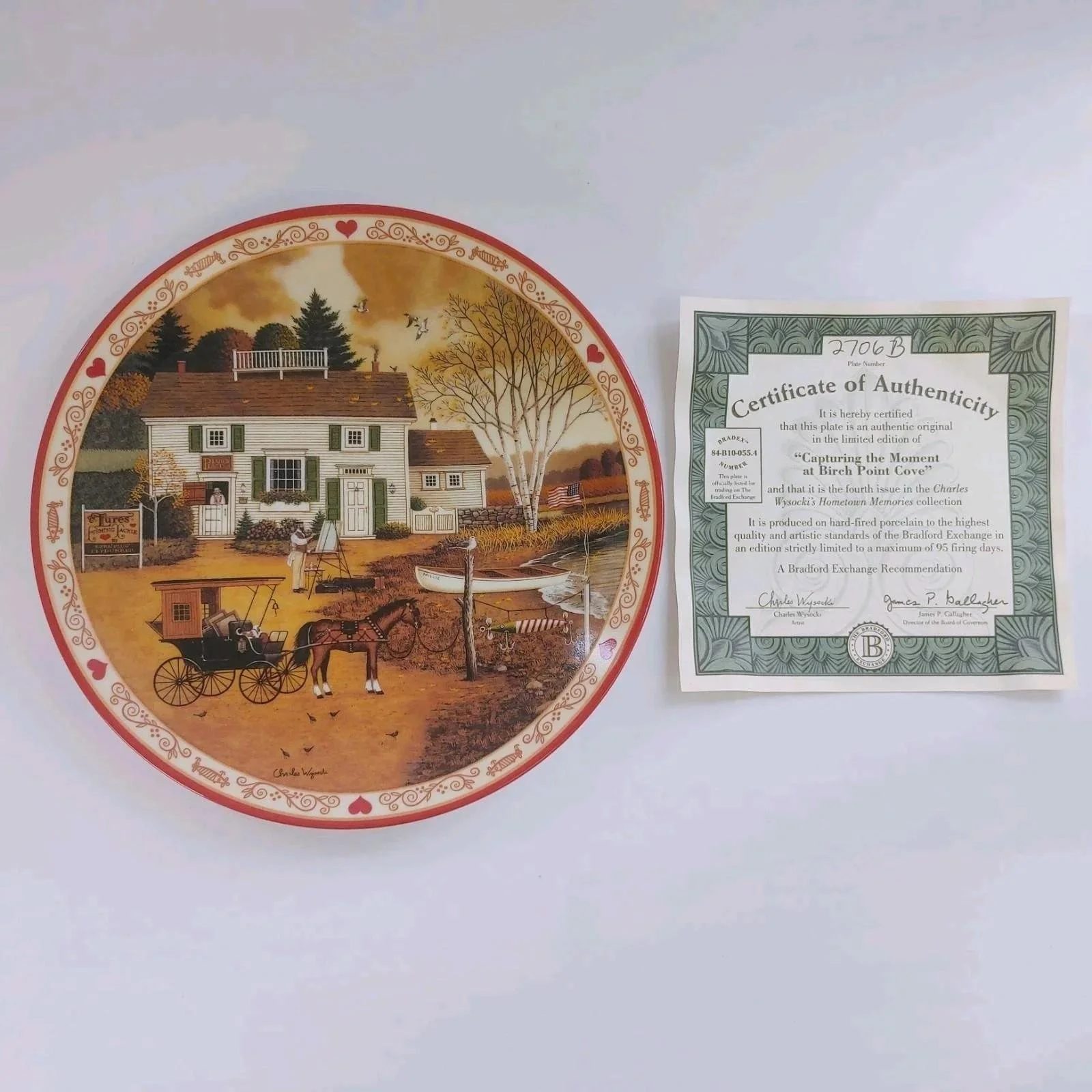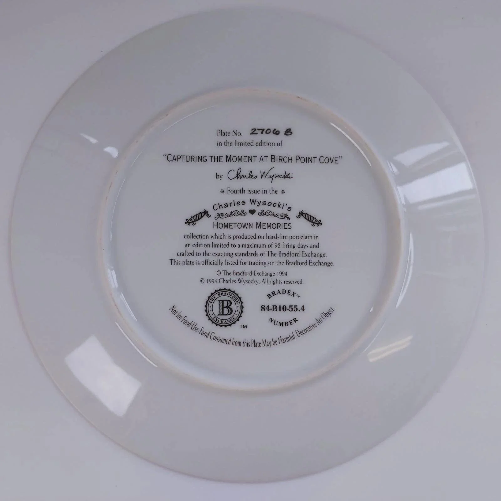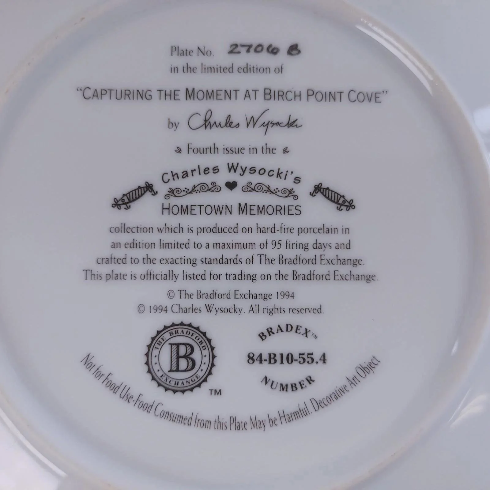 The product is a vintage 1994 Charles Wysocki collector plate from the Bradford Exchange, featuring the "Capturing the Moment at Birch Point Cove" pattern.