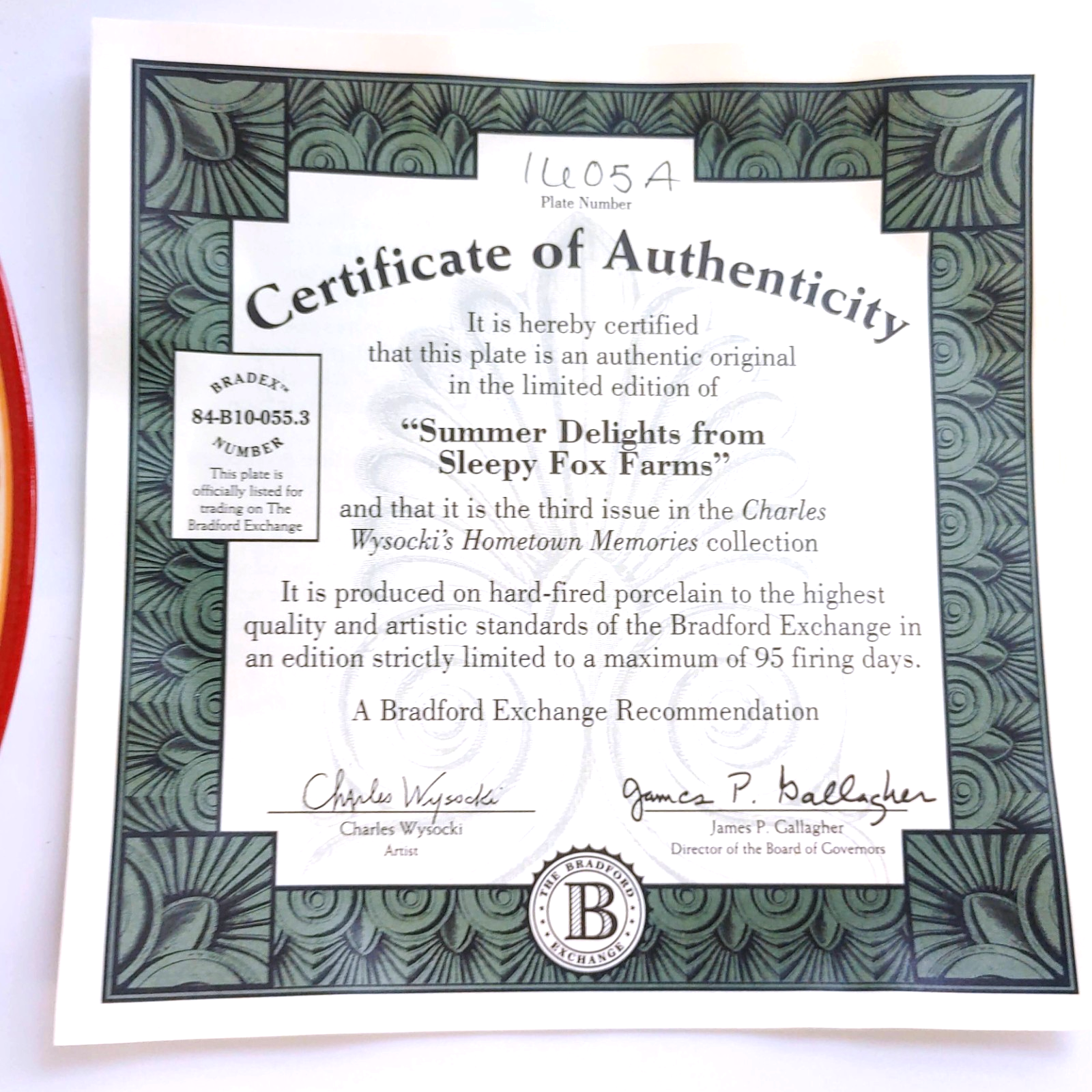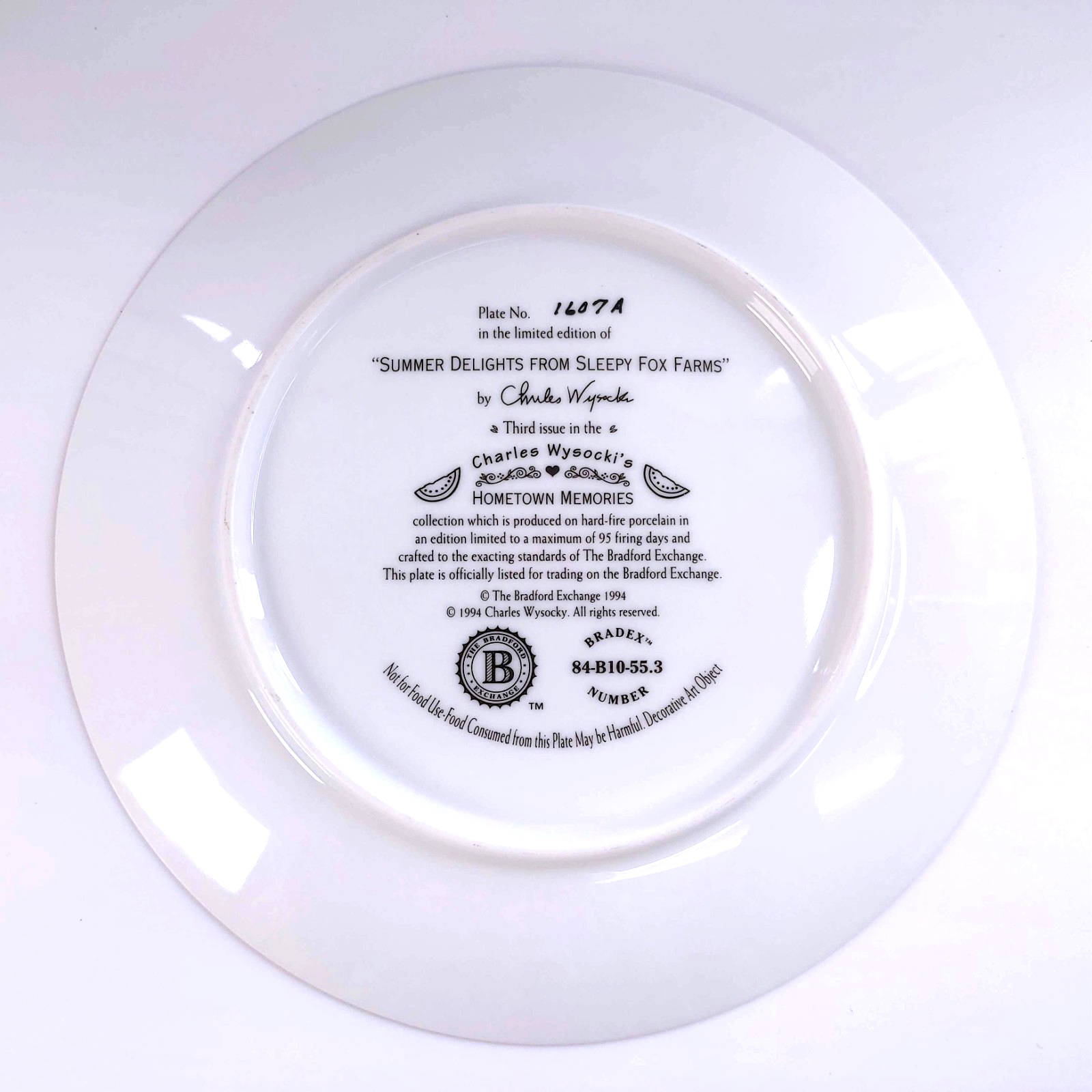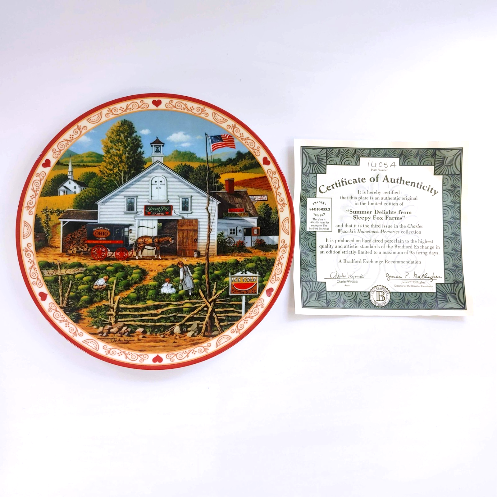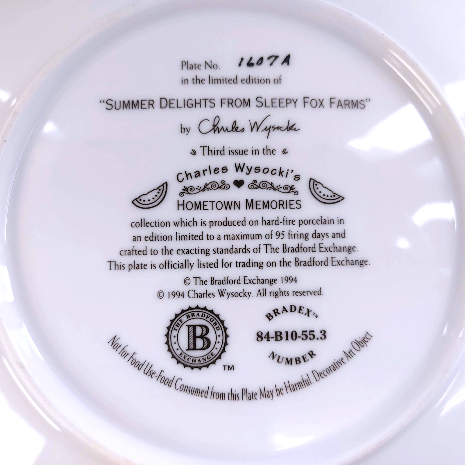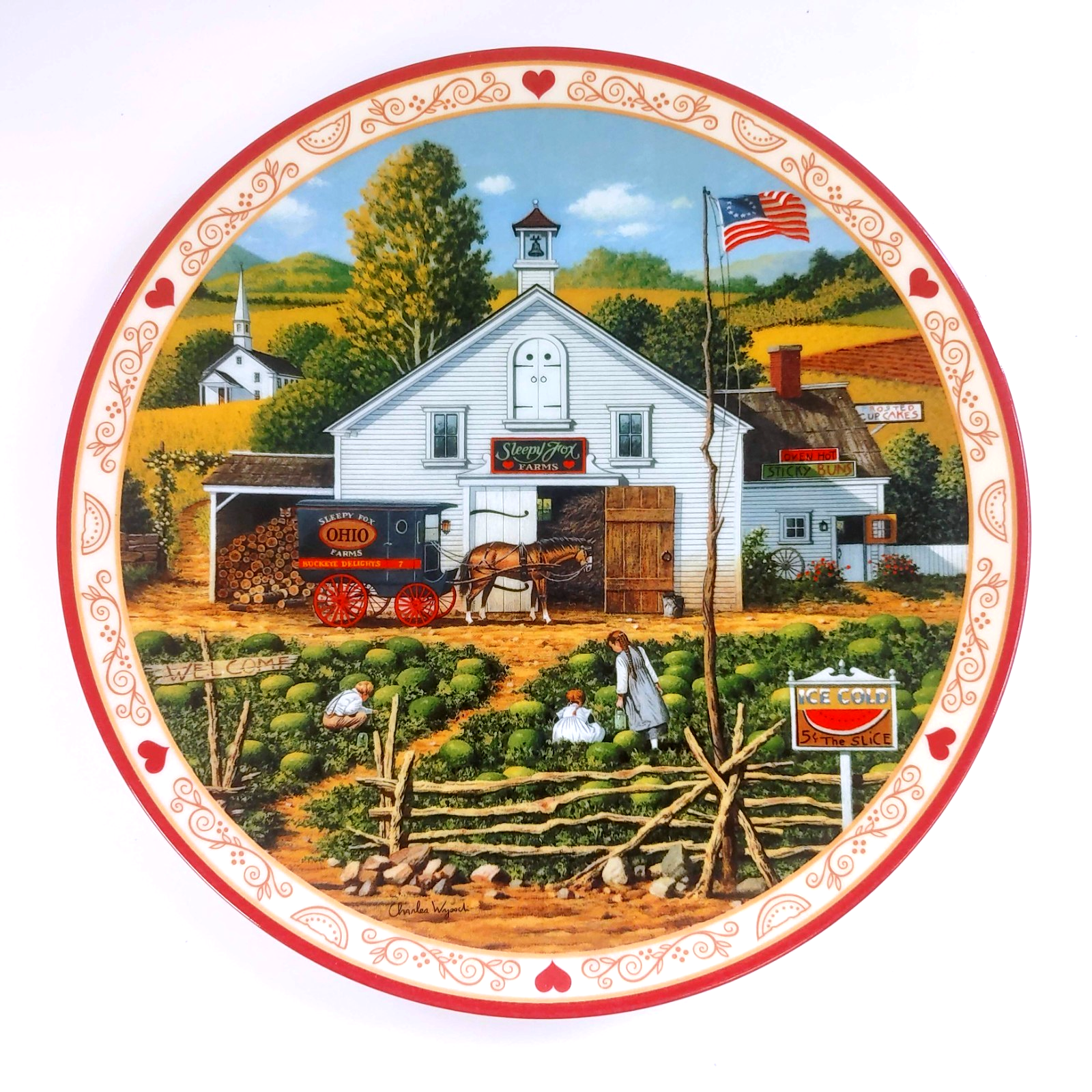 This is a wonderful vintage collector plate from the Bradford Exchange , featuring the beloved American folk art of Charles Wysocki . The plate, titled "Summer Delights from Sleepy Fox Farms," captures a nostalgic, idyllic scene of a white farmhouse and a field of watermelons . Details include a horse-drawn wagon marked "Sleepy Fox, Ohio Farms," a small sign advertising "Ice Cold 5¢ a Slice," and the American flag flying proudly. The charming red border with hearts and scrollwork completes the classic Americana feel.