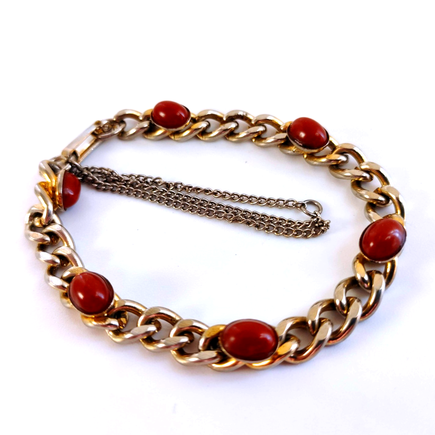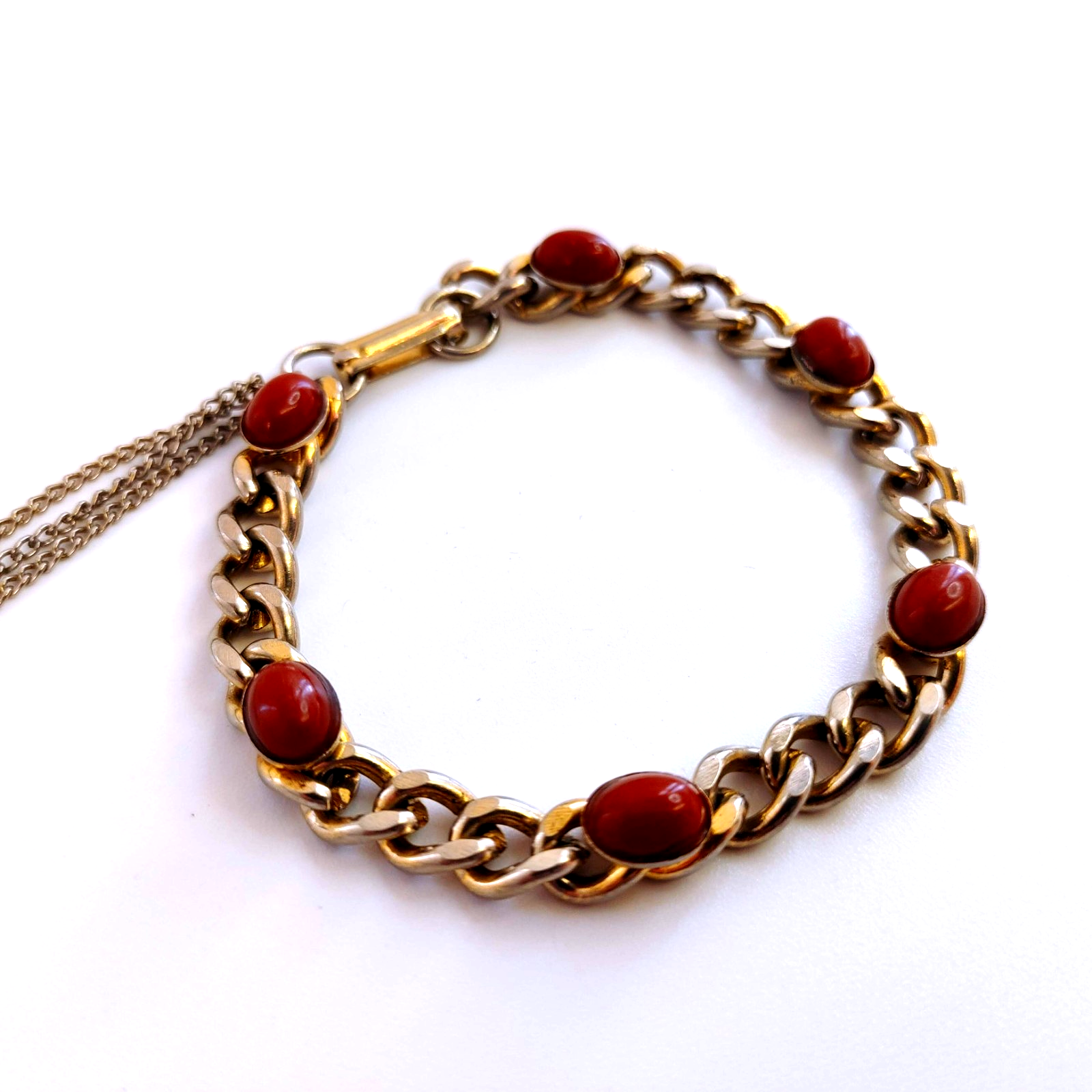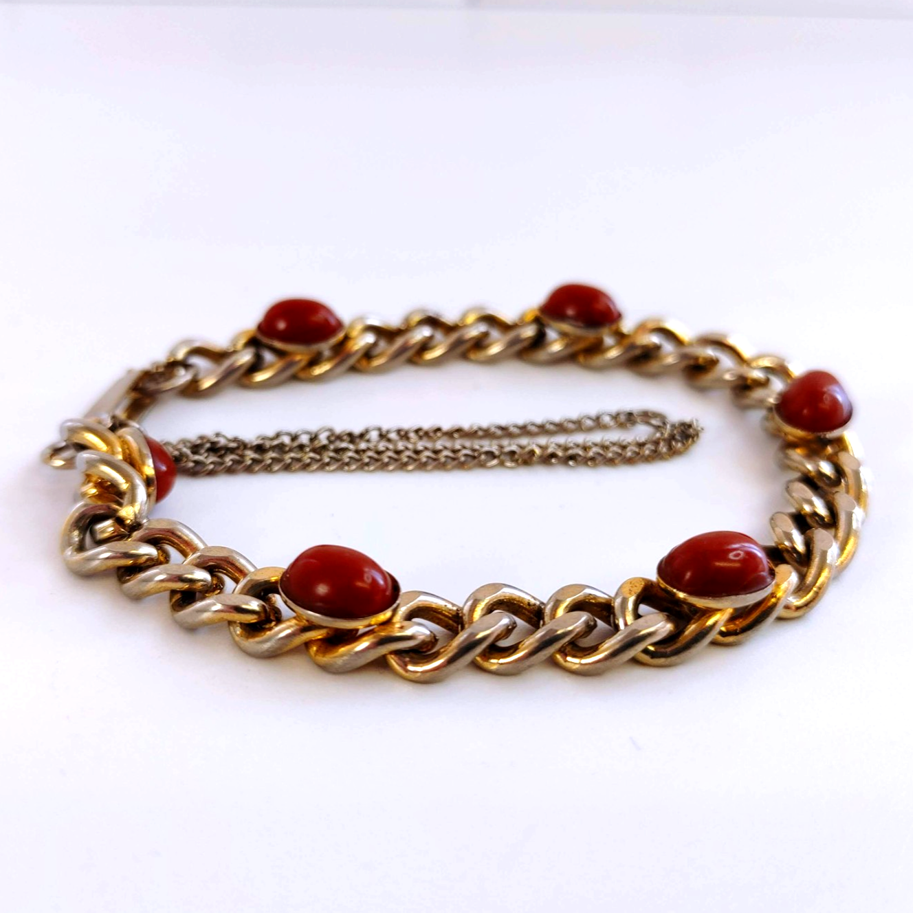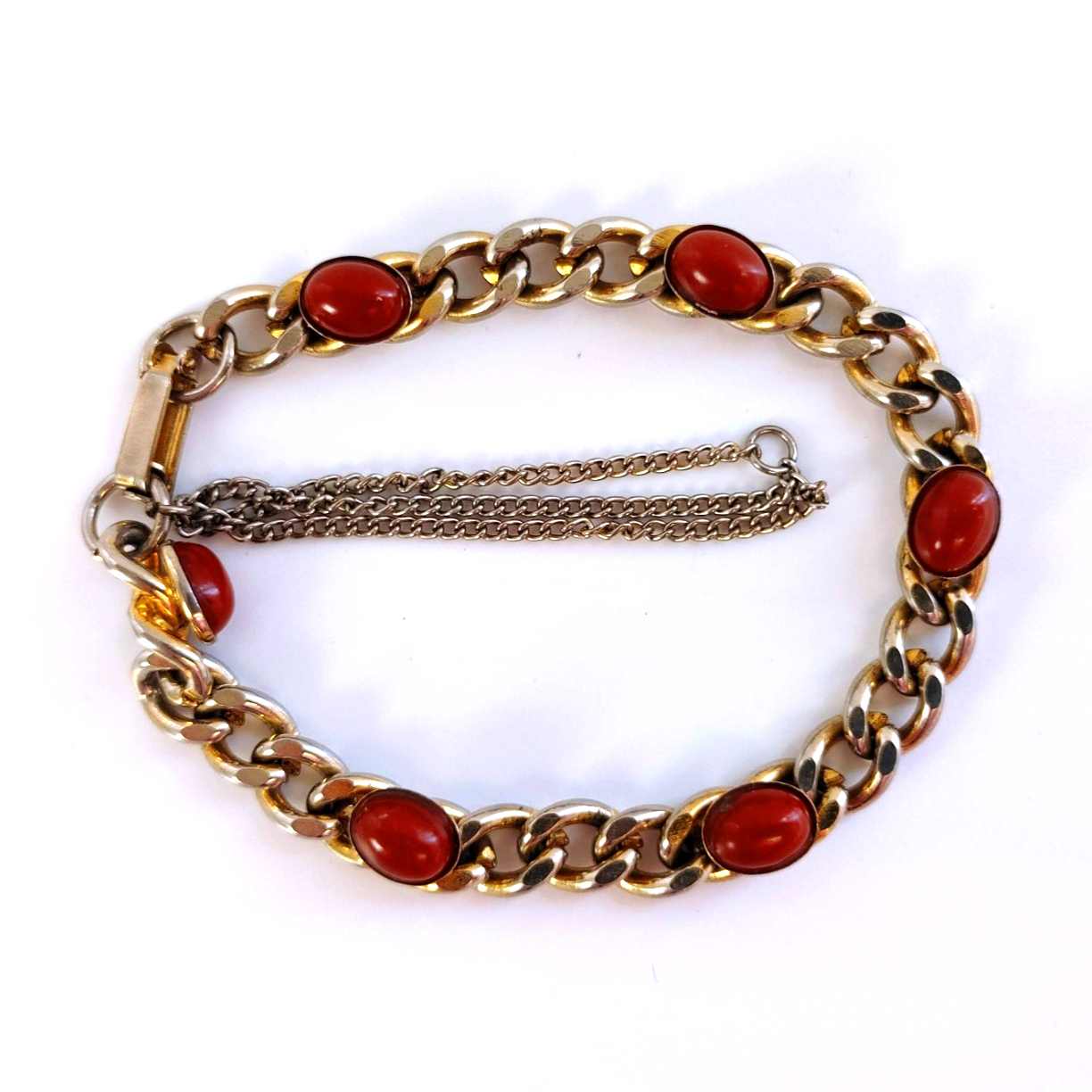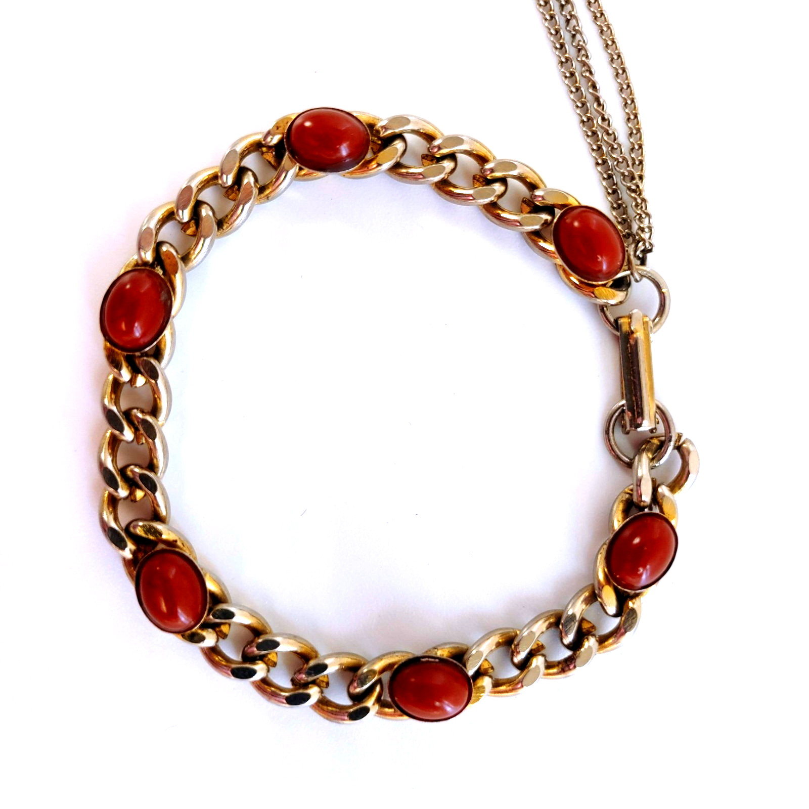 This vintage bracelet features a series of warm orange carnelian gemstones, each cut into a smooth, polished cabochon and set in a classic gold-tone bezel. The vibrant stones are complemented by a delicate curb link chain, creating a piece that feels both timeless and sophisticated.