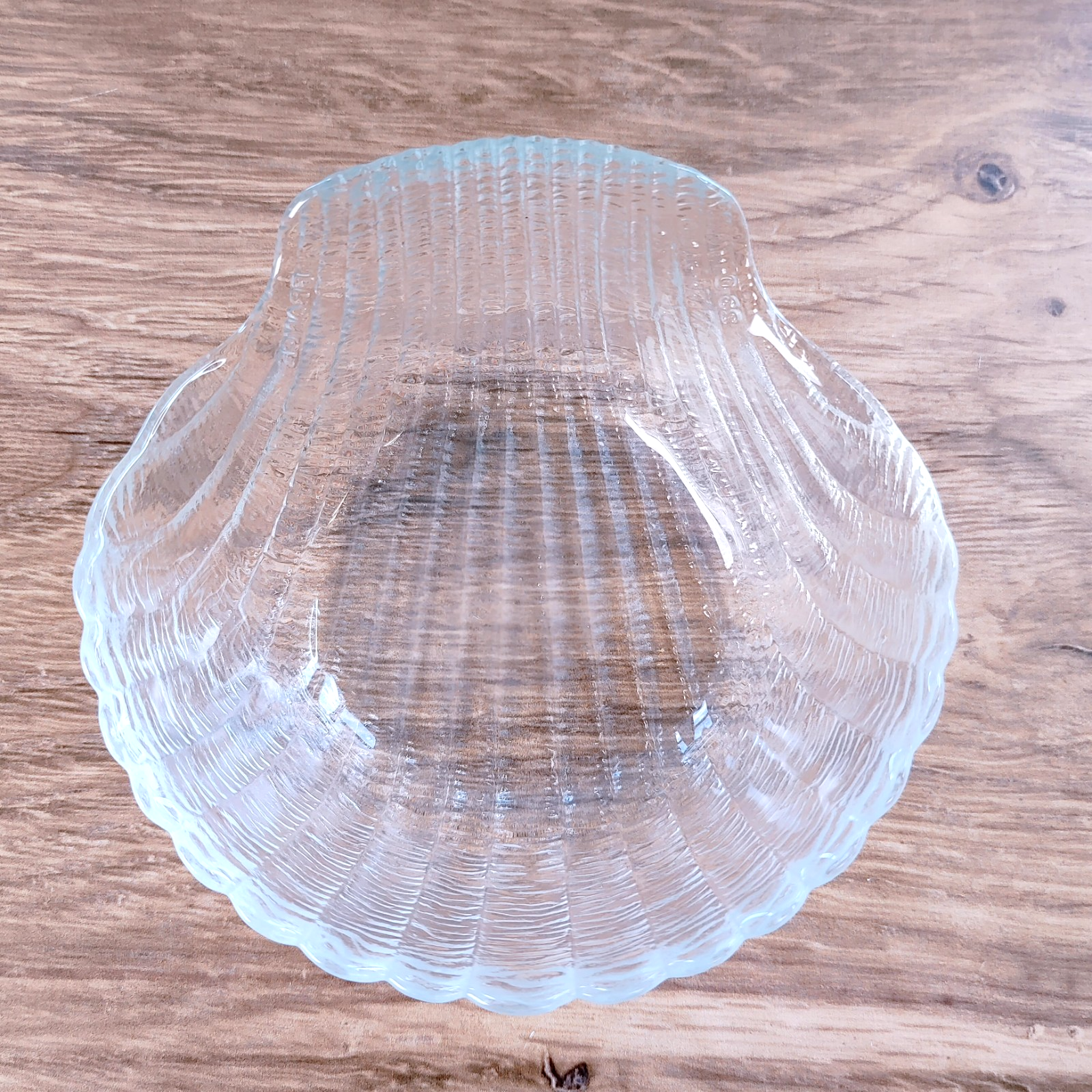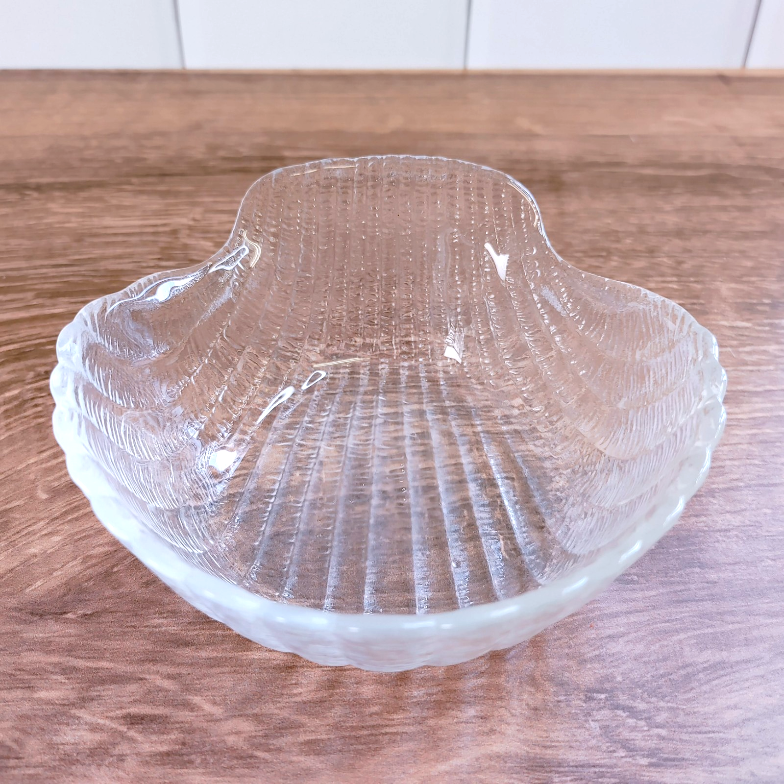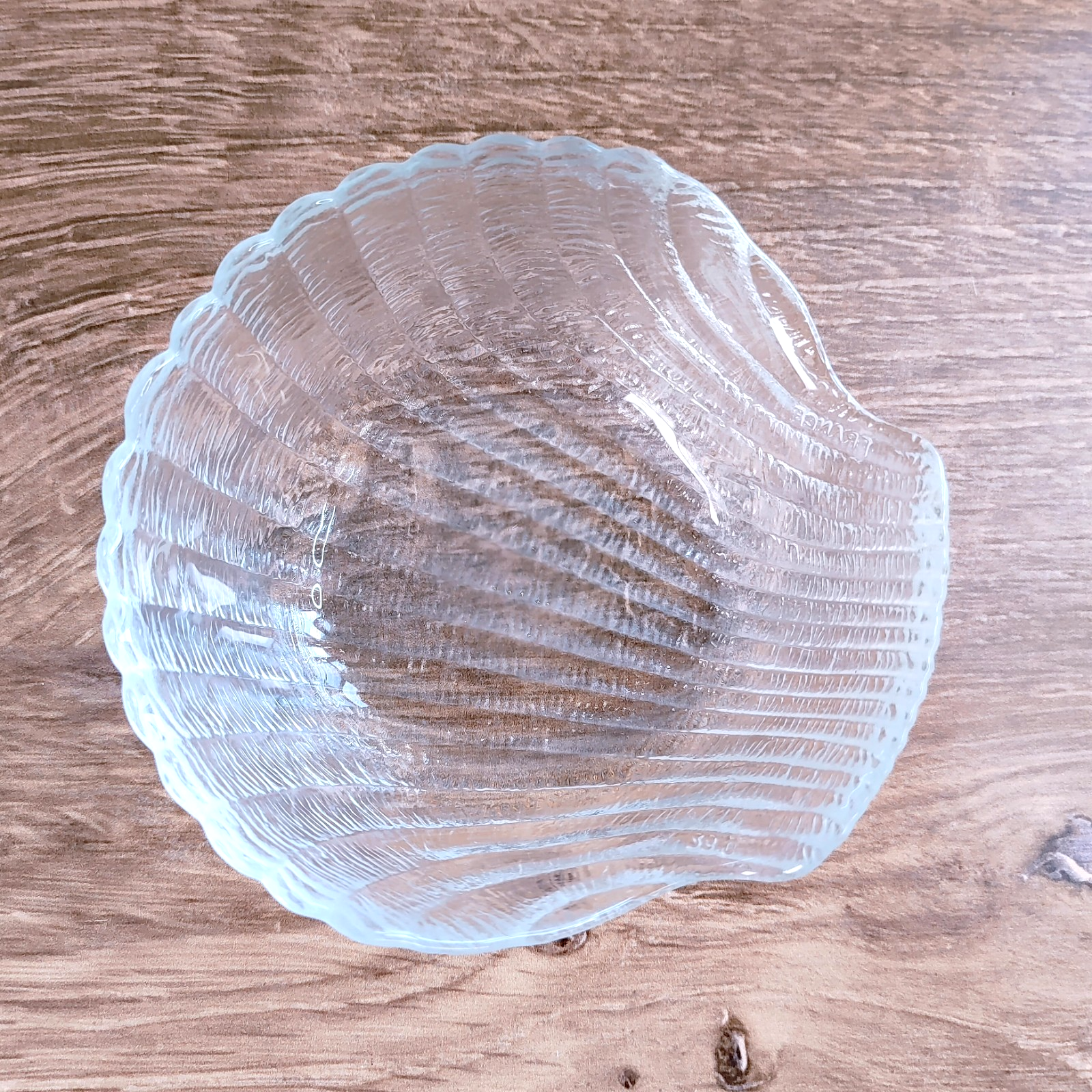 Add coastal elegance to your table with this beautiful vintage clear glass dip bowl. Crafted in France, this piece features a detailed scallop shell design with a practical flat bottom, making it a perfect blend of aesthetic charm and functional stability.