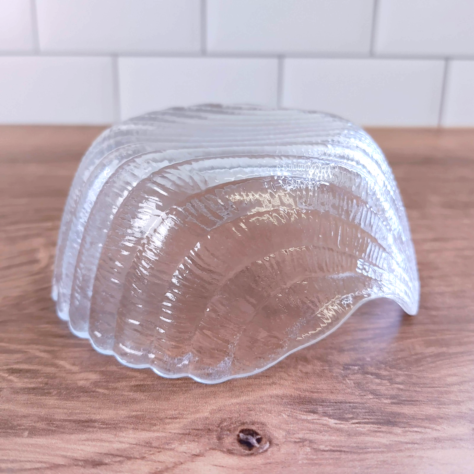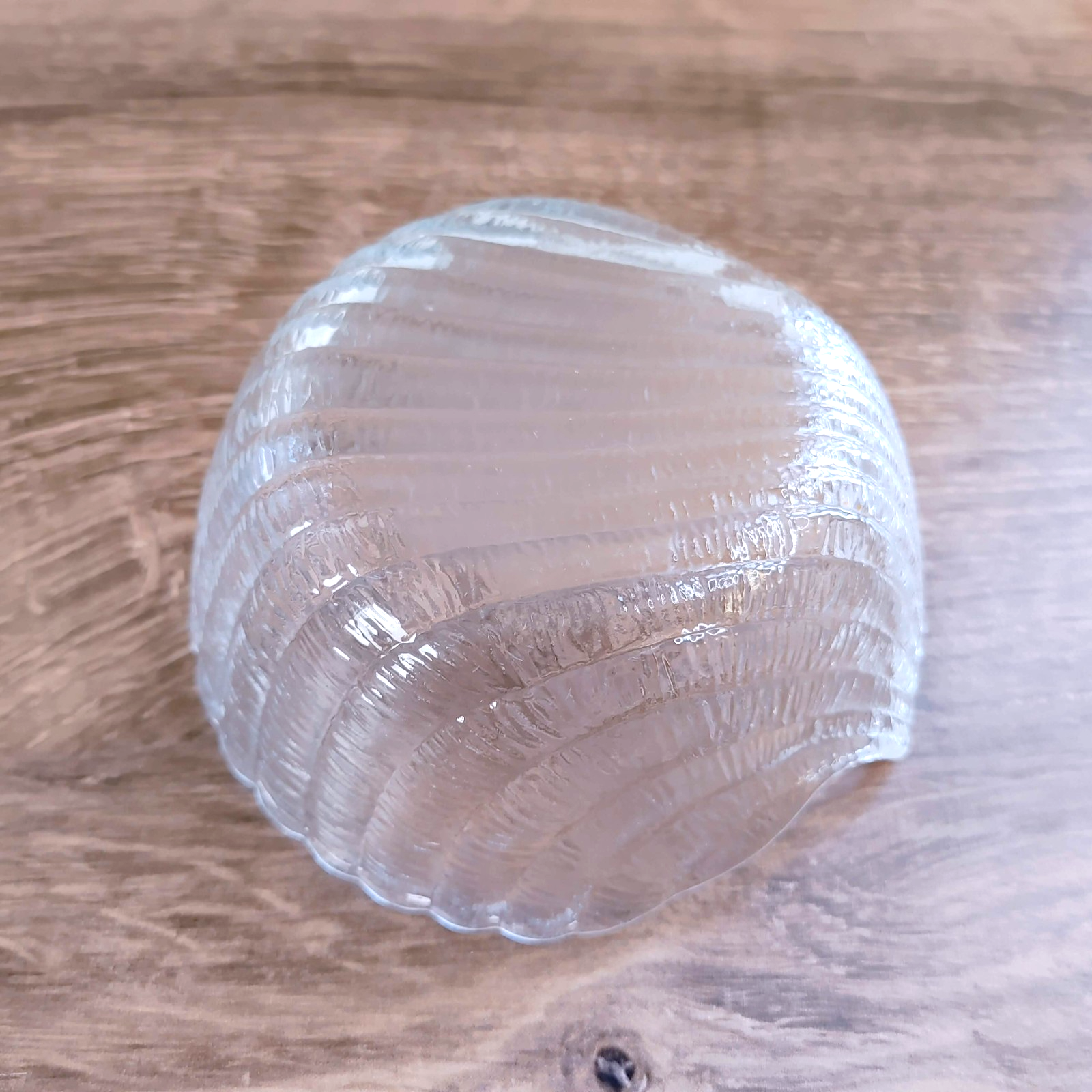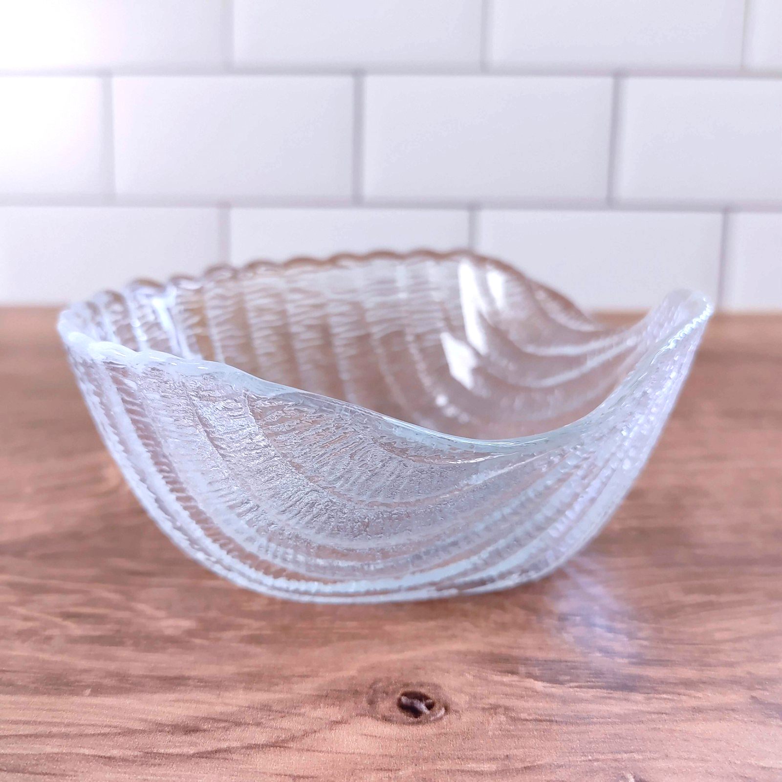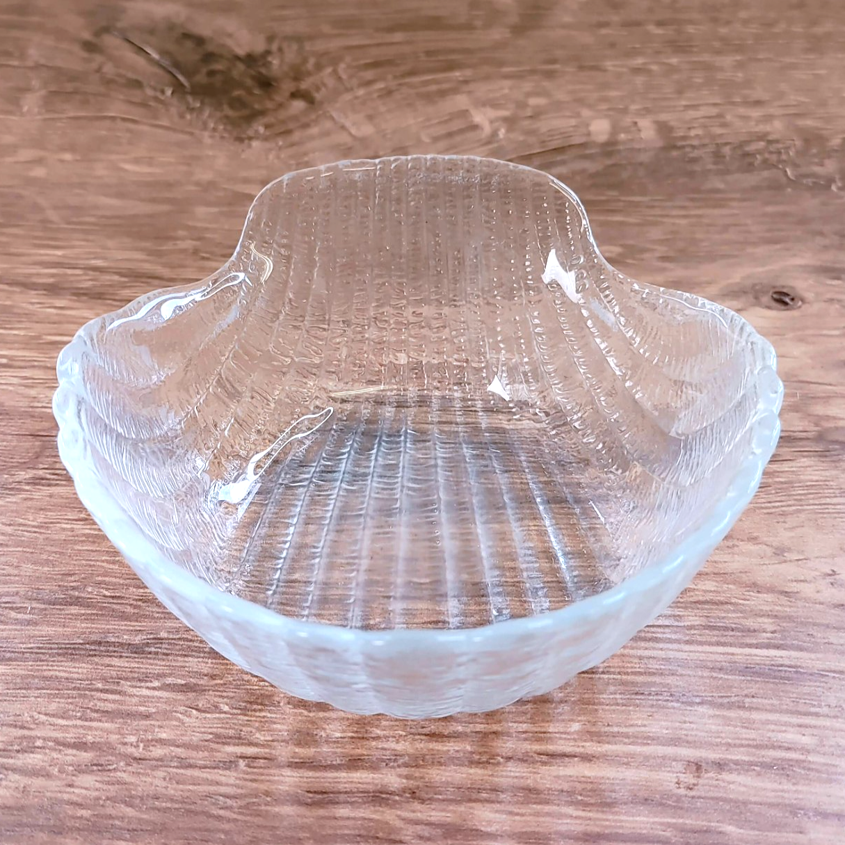Add coastal elegance to your table with this beautiful vintage clear glass dip bowl. Crafted in France, this piece features a detailed scallop shell design with a practical flat bottom, making it a perfect blend of aesthetic charm and functional stability.